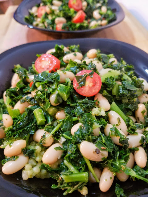 Add olive oil to large skillet and place over medium high heat. Add 1/2 bag frozen chopped kale and cover for 2-3 minutes, lifting the lid to stir occasionally. Once the kale is mostly defrosted, add the garlic, beans, and herbs, and let simmer for another 2-3 minutes. Lastly, add the grape tomatoes and cook for another minute on low, covered. Optional: serve over couscous
