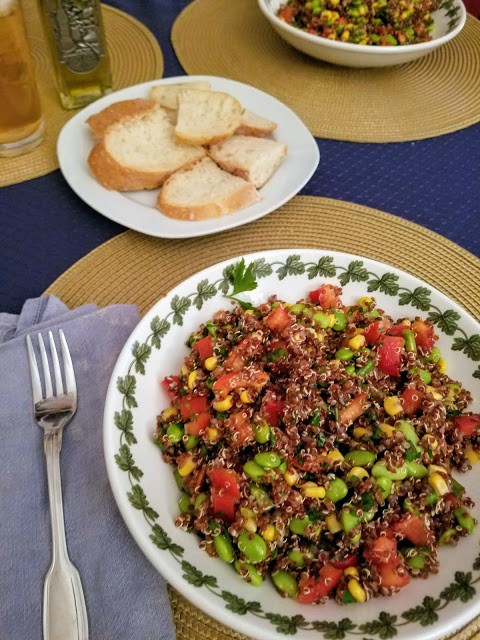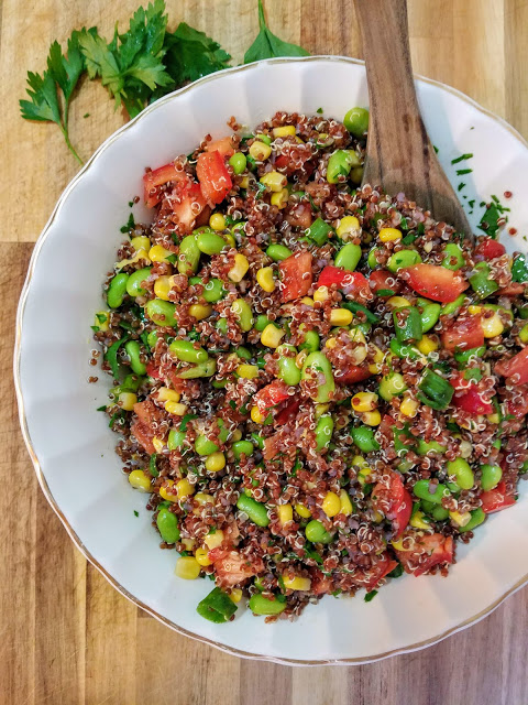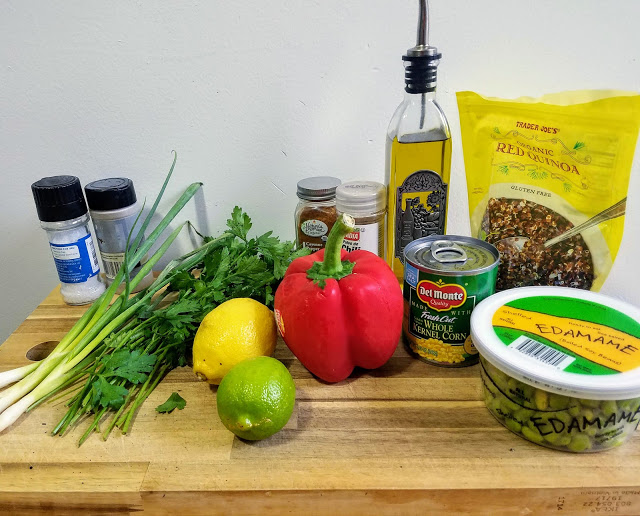 Bring 2 cups of water and 1 cup quinoa to a boil, reduce heat to simmer and cover, cooking until all the water is absorbed or about 15 minutes. Once finished, set aside and let cool completely. Meanwhile, dice red pepper, chop parsley, and slice scallions. If using frozen corn and shelled edamame, boil briefly (1-2 minutes) and drain completely. In a small bowl, whisk together the olive oil, citrus juice, cayenne, chili powder, and fresh cracked pepper and salt. Once the quinoa is cool, mix in a large bowl with corn, edamame, red pepper, parsley, and scallion. Drizzle the dressing over the salad and mix thoroughly. Cover and refrigerate for at least 2 hours.