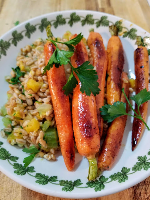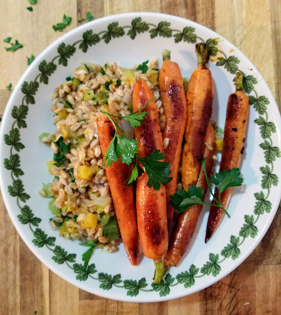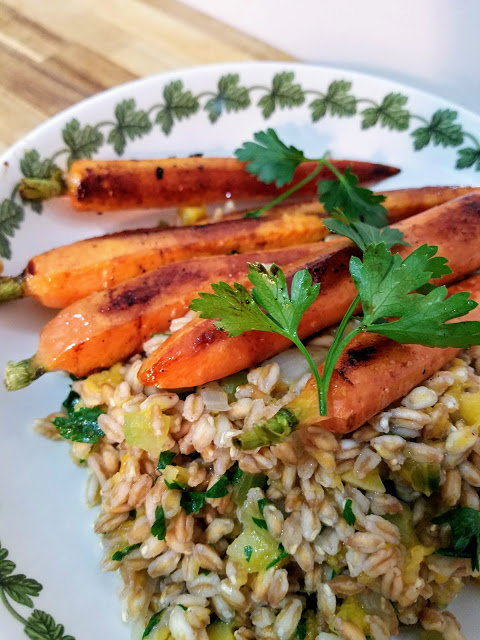 4. When the farro is finished cooking, drain any remaining water and add parsley, a drizzle of olive oil, a heavy pinch of salt and some fresh cracked pepper, and stir to incorporate. Serve carrots over farro with parsley for garnish.
