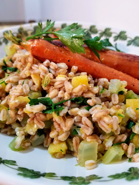 2. In a large saucepan, heat 1 Tbsp olive oil over medium flame. Add celery and onion to the pan and cook for 2-3 minutes or until just softened. Next add frozen butternut squash and cook an addiitonal 1-2 minutes or until the squash has defrosted. Pour in farro and 2 cups of boiling water and stir to make sure nothing sticks to the bottom. Simmer for 20 minutes or until the farro is soft and tender.