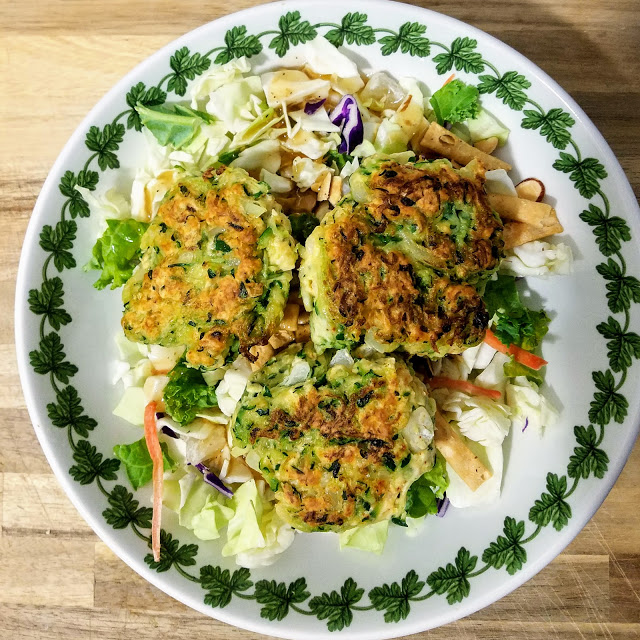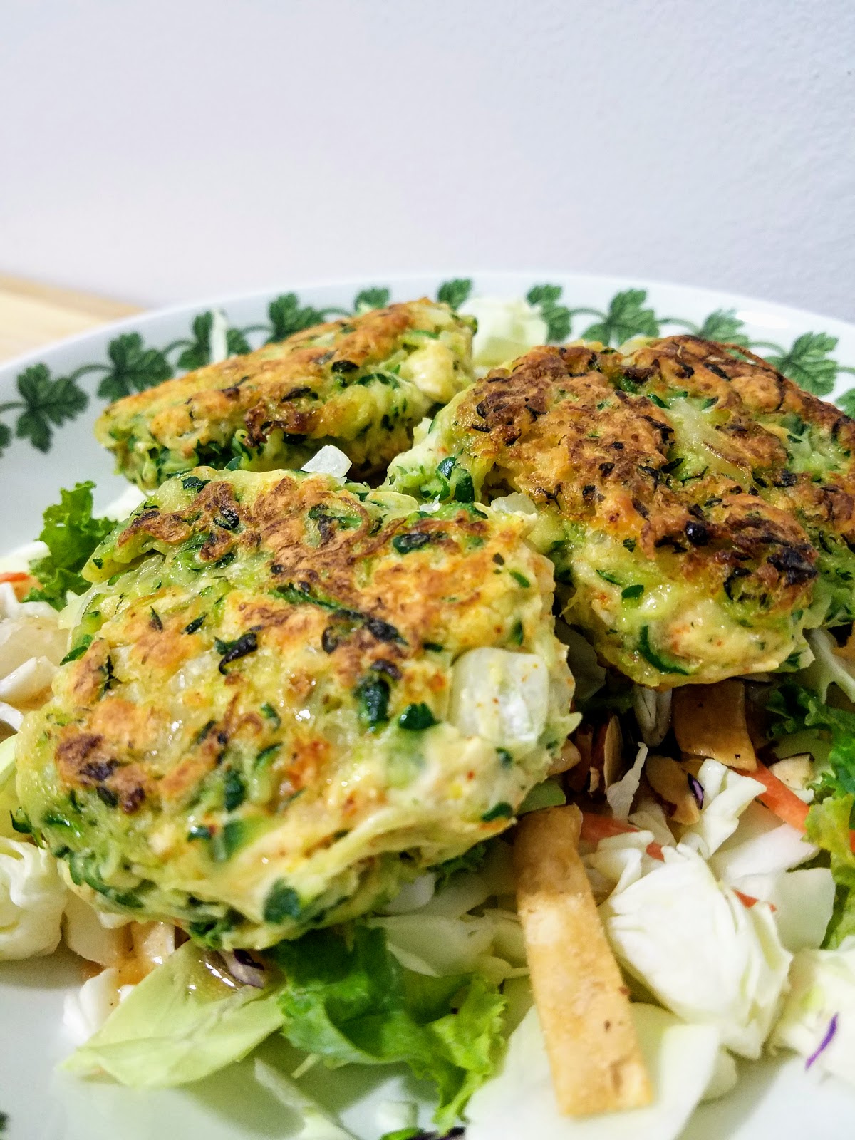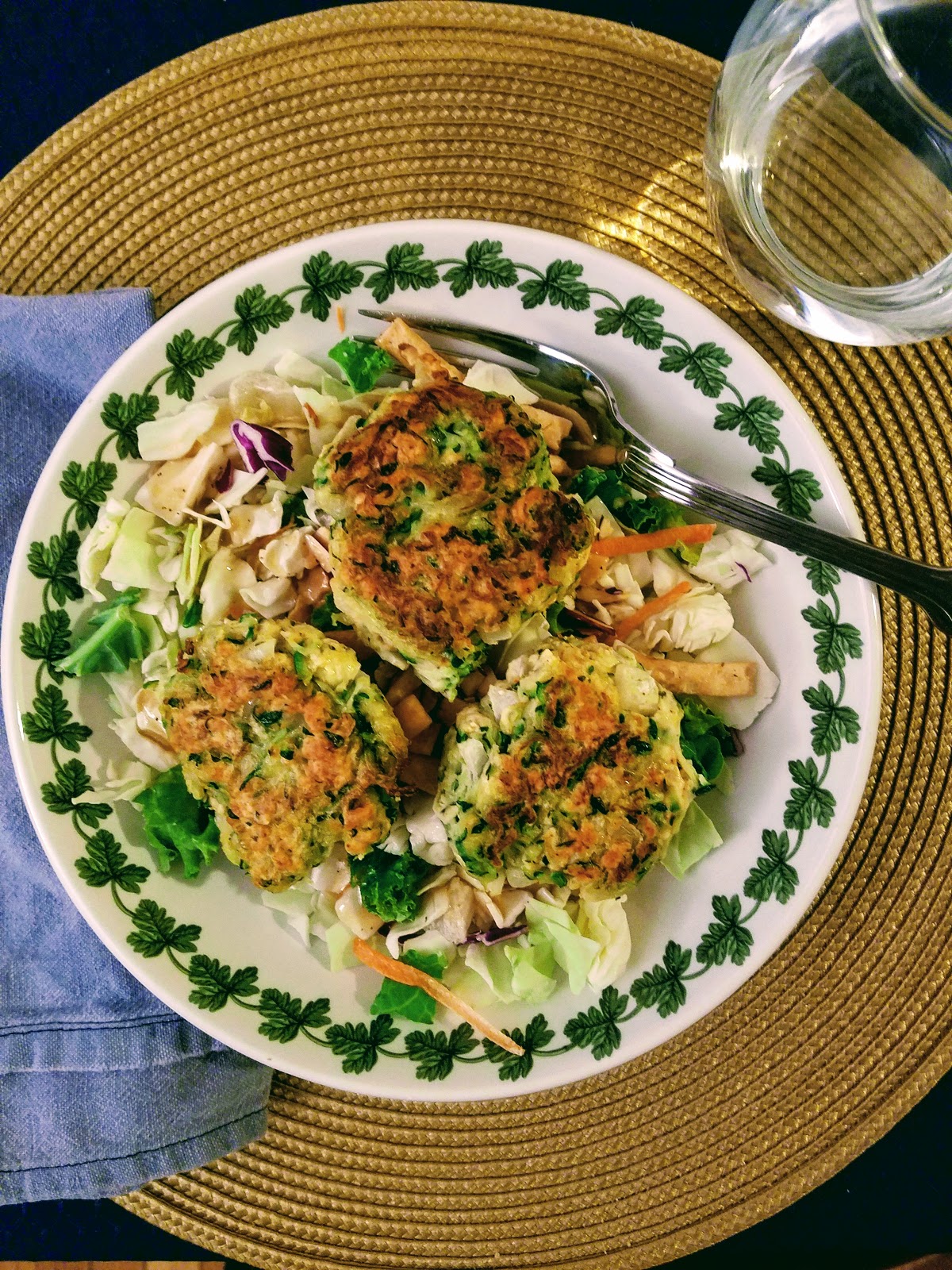 So now begged the question, with what do I accompany the zucchini pancakes? Most times that I order groceries, I order a bag of pre-mixed salad to use for either a few weekday lunches or a quick dinner side dish. For lunch, it’s a great working girl (or boy) hack, and usually you can find at least one brand that is on sale. This week I ordered an Asian Sesame Salad Kit, and I decided to have that with my pancakes. Just thinking about the nice crisp crunch of the cold salad with the warm soft zucchini pancake had me salivating. And let me tell you, it was just as delightful as I had hoped!