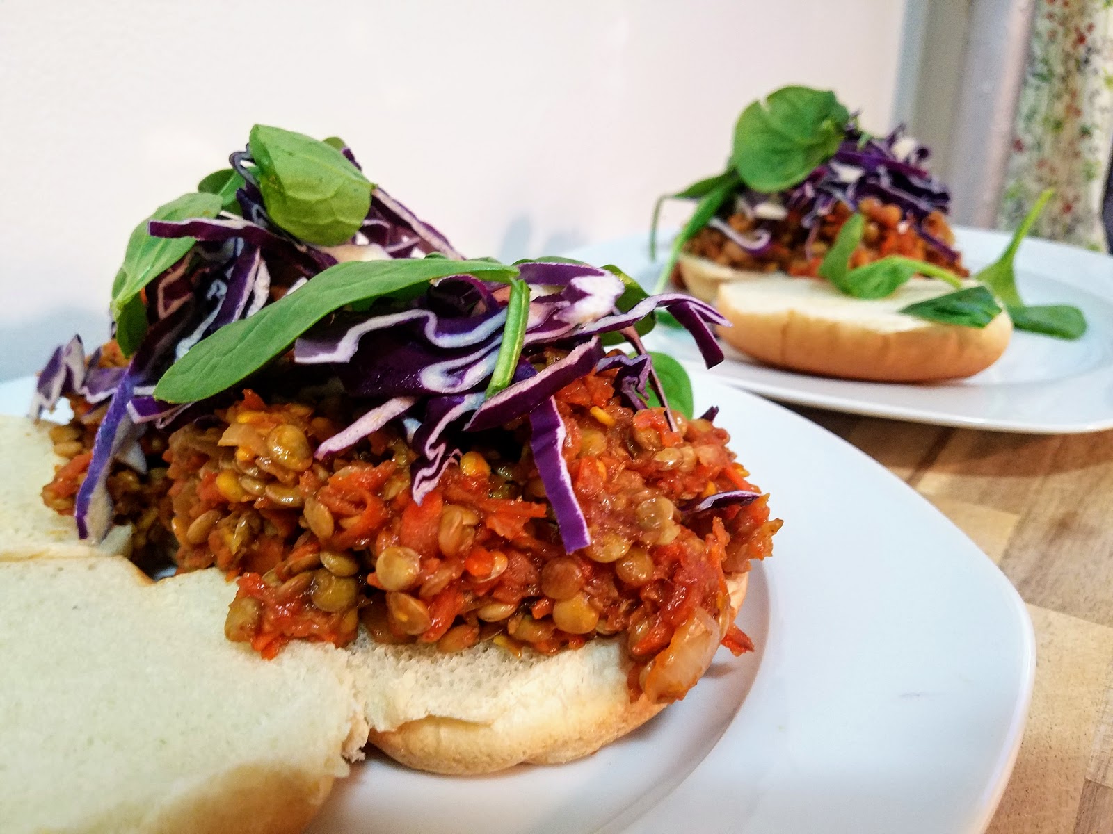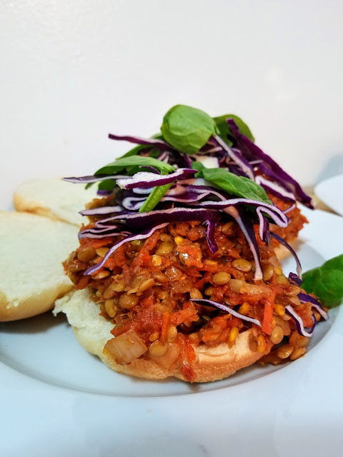 First step towards these delicious sandwiches is to simmer one cup of green lentils for about 15min or until they are mostly tender and the water is mostly absorbed. Meanwhile, it’s the perfect time to do a little bit of vege prep: peel and chop one small yellow onion and peel and shred about 3-4 carrots (or until you have about 2 cups). Saute the chopped onion in olive oil on medium heat until its starting to become translucent. Then add the mostly cooked lentils, the shredded carrots, and a generous squeeze of the vegan barbecue sauce of your choice, garlic powder, paprika (for smokiness), and healthy pinches of salt and pepper. Mix it all together until everything is coated in the barbeque sauce mixture, and let it simmer for a few minutes. Then, transfer about half of the mixture into a food processor and pulse about 10 times, and return to the pan and incorporate – this creates a more realistic texture for that “pulled pork” feel. Top with shredded red cabbage and some spinach for an even bigger health punch, and not to mention yummy contrasting textures and colors!