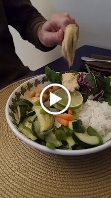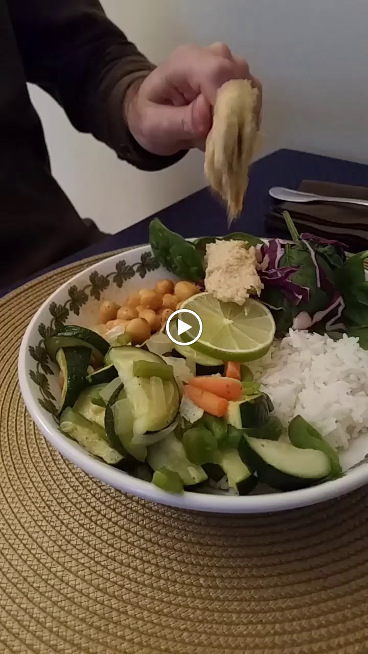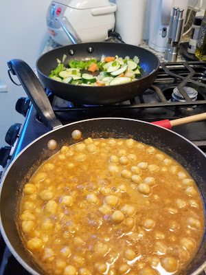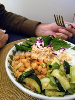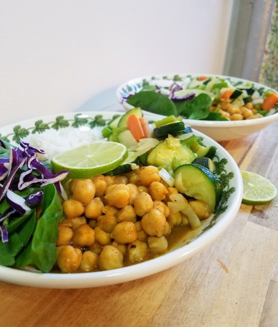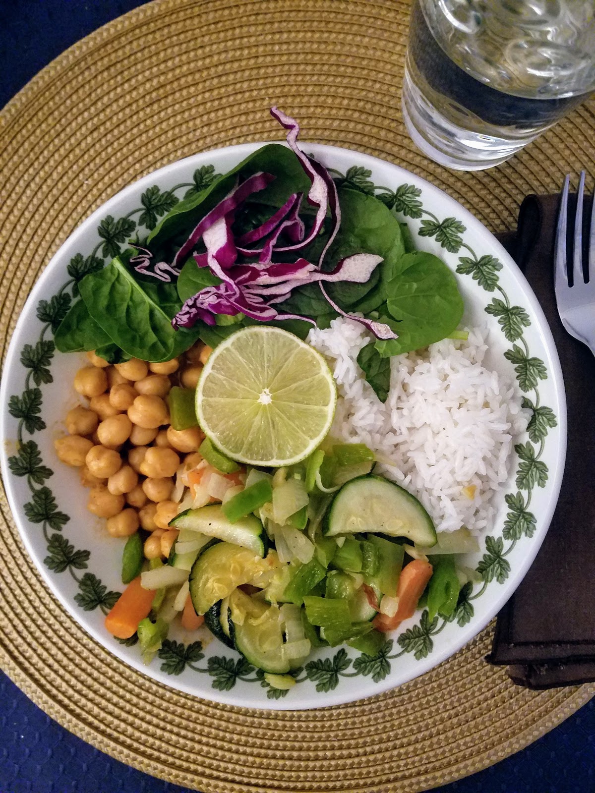 Firstly, we turned on the rice cooker to cook a cup of basmati rice. Then we chopped up the sorry looking half of a zucchini, a few straggler baby carrots, a half of green pepper that was left, a bit of yellow onion, and two cloves of garlic. We sauteed the veggies in olive oil on low and seasoned with salt and pepper until they were slightly softened. Meanwhile, we put the can of chickpeas into another pan with the cup of coconut milk, tablespoon or so of tomato sauce leftover from last pasta night, palmful of curry powder, a sprinkle each of cumin, ground ginger, and roasted red pepper, and let that simmer on low while the rice and veggies finished cooking. Everything finished up in the next ten minutes or so, and then we assembled the dish adding some fresh baby spinach and red cabbage for nutrition, flavor, and texture. The warm curry and cooked veges were nicely offset by the crunchy raw spinach and cabbage as well as the starchy rice. It was spicy but not too spicy – just right!