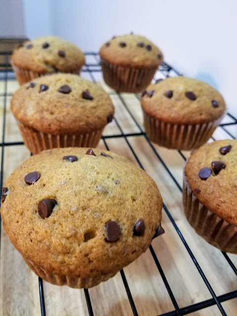 Preheat oven to 350 degrees. Cream together 1/4 cup coconut oil and 3/4 cup sugar. Once the sugar is no longer granular, add 1 flax egg and 1/4 almond milk and mix. Then add 1 1/4 cup flour, 1/2 tsp baking soda, 1 tsp cinnamon, and pinch of salt and mix together. Next, mix in the mashed banana and 1/2 vanilla until incorporated. Spoon into a greased or lined muffin tin until each cup is about 3/4 full. Top with some dairy-free chocolate chips if desired. Bake for 25 minutes, or until a toothpick comes out clean. Let cool completely. Enjoy!