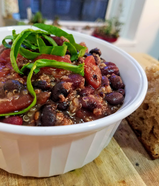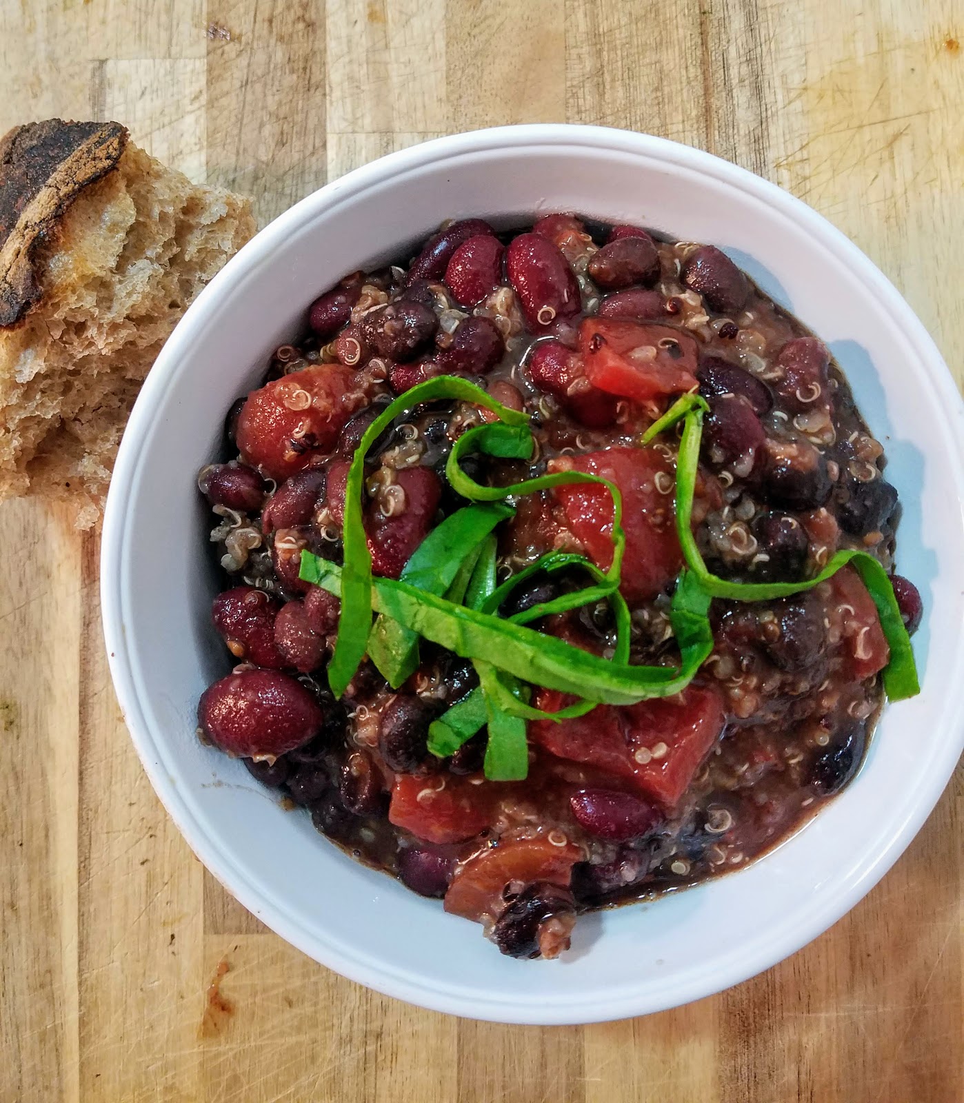 This specific busy evening, hubby had an event for work that I was planning to stop by briefly on my way home. That meant that 1) I would be home later than normal and hubby would be home even later than me, and 2) hubby and I arrive home (and hungry!) at different times…1+2= definitely a slow cooker night! To make it easy on myself, I got all the ingredients for a bean chili out the night before. In the morning, I threw it all in the slow cooker before leaving for work, and then picked up a loaf of crusty bread on my way home to make the meal complete. When I got home, the chili was thick and beautiful, and the flavors had made our home smell delicious. It tasted as good as it looked and smelled, and left both hubby and I feeling full and satisfied after a long, busy day.