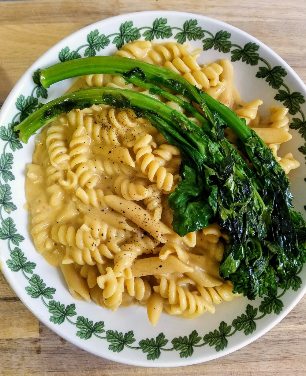 This recipe is a Chef Chloe adaptation. Her vegan Italian cook book was the first one I bought when I was first trying out this new lifestyle, so a lot of my staples were formed with her excellent guidance. This meal is the perfect luxury for those days when you deserve it goddammit (and you know we all have those days!), even though this is *way* healthier than eating regular mac-n-cheese. This dairy-free rendition comes in at a fraction of the calories and fat, and it still tastes decadent. And, if you pair it with roasted broccolini like we did, you add fiber and vitamins, not to mention texture and color!