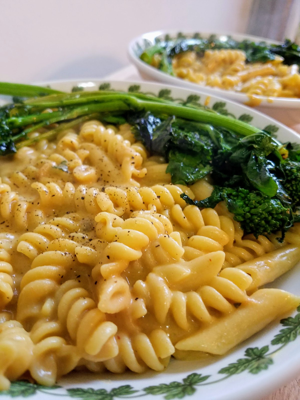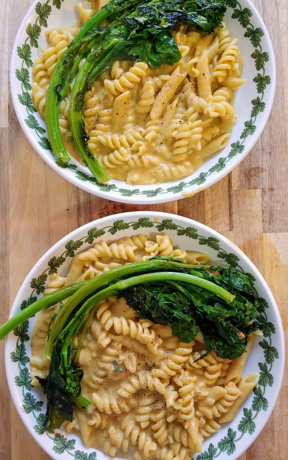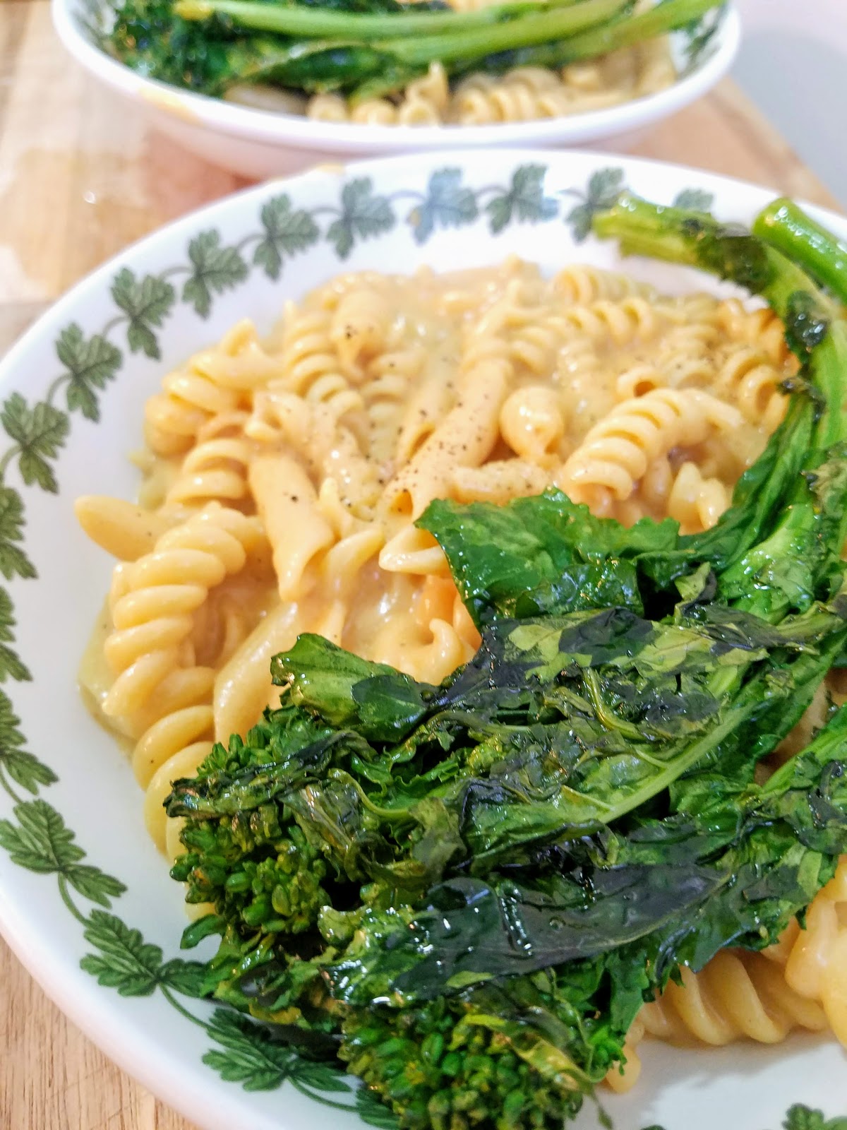 This recipe is a Chef Chloe adaptation. Her vegan Italian cook book was the first one I bought when I was first trying out this new lifestyle, so a lot of my staples were formed with her excellent guidance. This meal is the perfect luxury for those days when you deserve it goddammit (and you know we all have those days!), even though this is *way* healthier than eating regular mac-n-cheese. This dairy-free rendition comes in at a fraction of the calories and fat, and it still tastes decadent. And, if you pair it with roasted broccolini like we did, you add fiber and vitamins, not to mention texture and color!