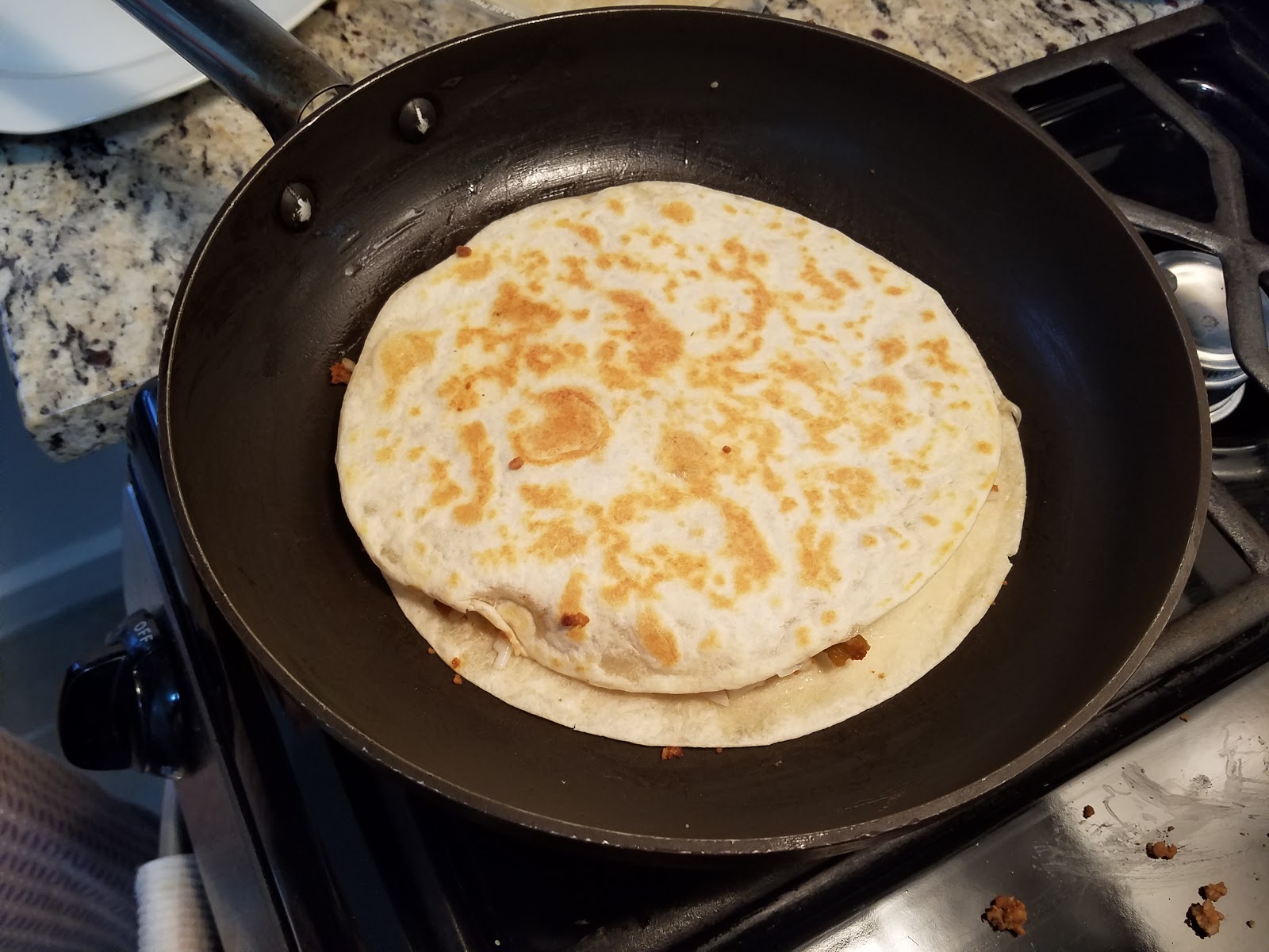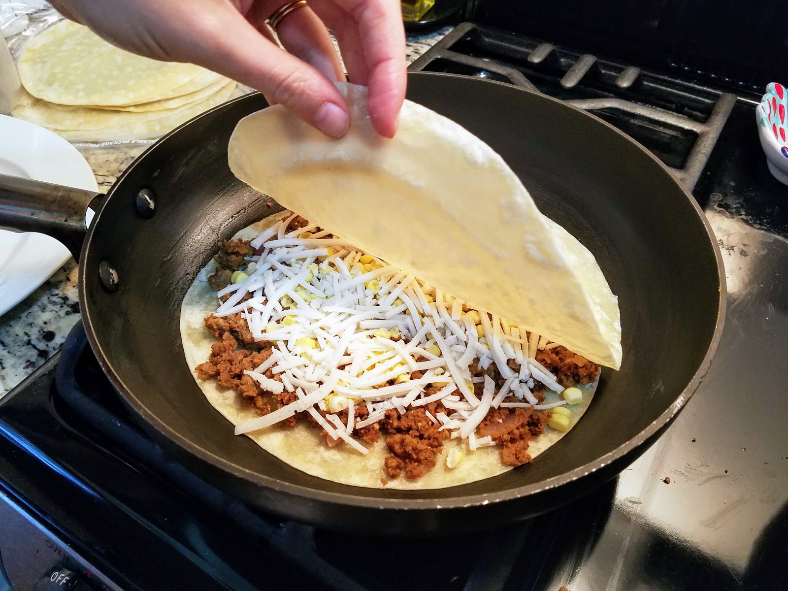 BUT, this week I was feeling experimental in my grocery shopping, and picked up some Lightlife Veggie Ground Crumbles and decided to use it in between tortillas to make loaded quesadillas. We barely ever eat quesadillas because I don’t like the idea of just plain Daiya cheese-substitute melted in between two flour tortillas – I am a girl who needs more texture and substance than that! And I have been craving more protein in my life lately. These crumbles have 11g of protein per serving, so they were a perfect addition to my quesadillas.