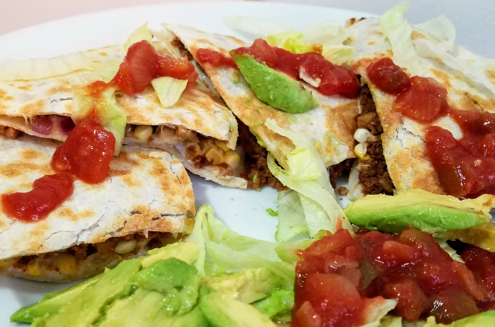 Over medium heat, saute red onion in a pan sprayed lightly with cooking spray. Once soft and slightly browned, add crumbles and break apart with a wooden spoon. Then add taco seasoning and salsa and stir to combine, leaving the pan on low to keep warm. Meanwhile, heat up large skillet on medium high heat. Place a tortilla in the pan, then create thin layers of the crumble mixture, a sprinkling of corn, and cheese, topping with another tortilla. Press down with spatula and cook for about three minutes, flipping when the bottom tortilla edges start to curl up. Cook on the opposite side for another three minutes. Transfer to a cutting board and cut with a pizza cutter. Top with more salsa, avocado, and shredded lettuce. Buen Provecho!