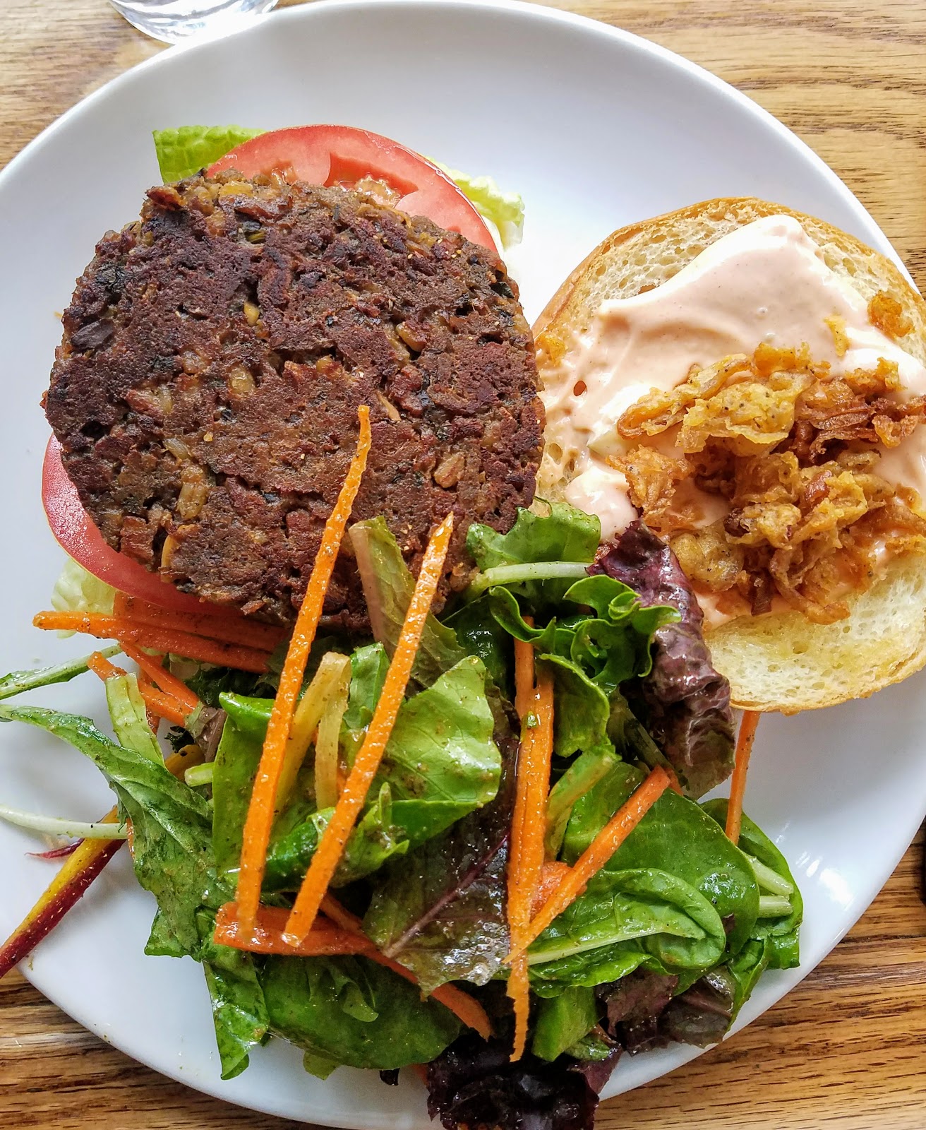 Next came our entrees. I ordered the UVK Quarter Pounder, and hubby went for the Chick’un and Waffles. My burger was huge – loaded with fried onion rings, lettuce, tomato, and a “special” sauce that dripped down my hand in the best way. The sheer size of it was enough to convert non-believers into trying a veggie burger. Trust me, it’s not for wimps. (I may or may not have finished it all, no big deal) Luckily I ordered the salad instead of the fries, because otherwise hubster would have had to carry me out of there.