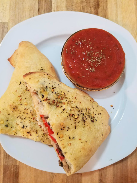 Defrost pizza dough. Preheat oven to 375 degrees. Roll out dough on floured surface until it is about 1/2 inch thick. Cut the dough into 4 squares. Fill one half of the squares with desired toppings and 1/2 cup of mozz shreds, leaving a one inch border. Fold other half on top, creating a triangle, and pinch the edges to seal. Place calzone on a cookie sheet. Brush the top with olive oil and sprinkle with oregano and crushed red pepper. Bake for 20-25 min or until bottom is crusty and deep brown and top is golden. Let cool down for a few minutes, and then serve with warmed pasta sauce and more olive oil.