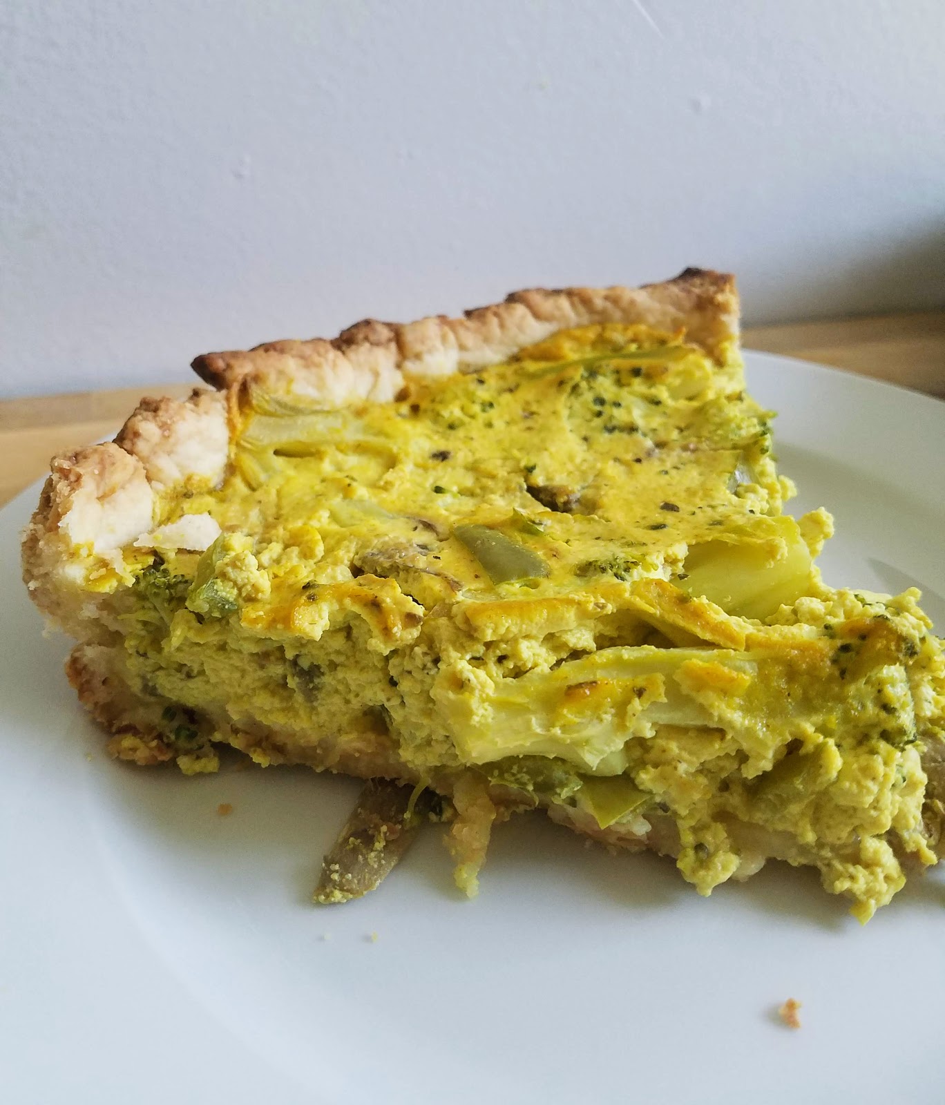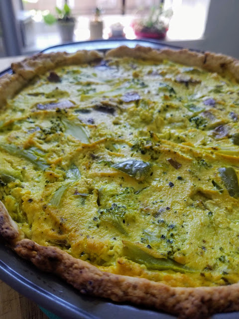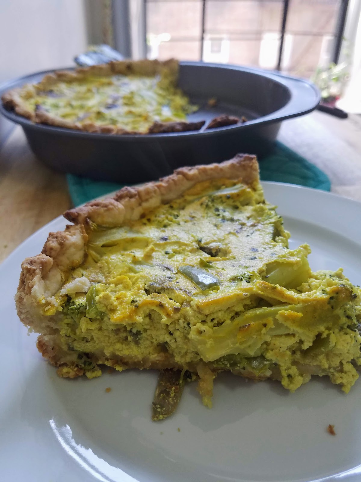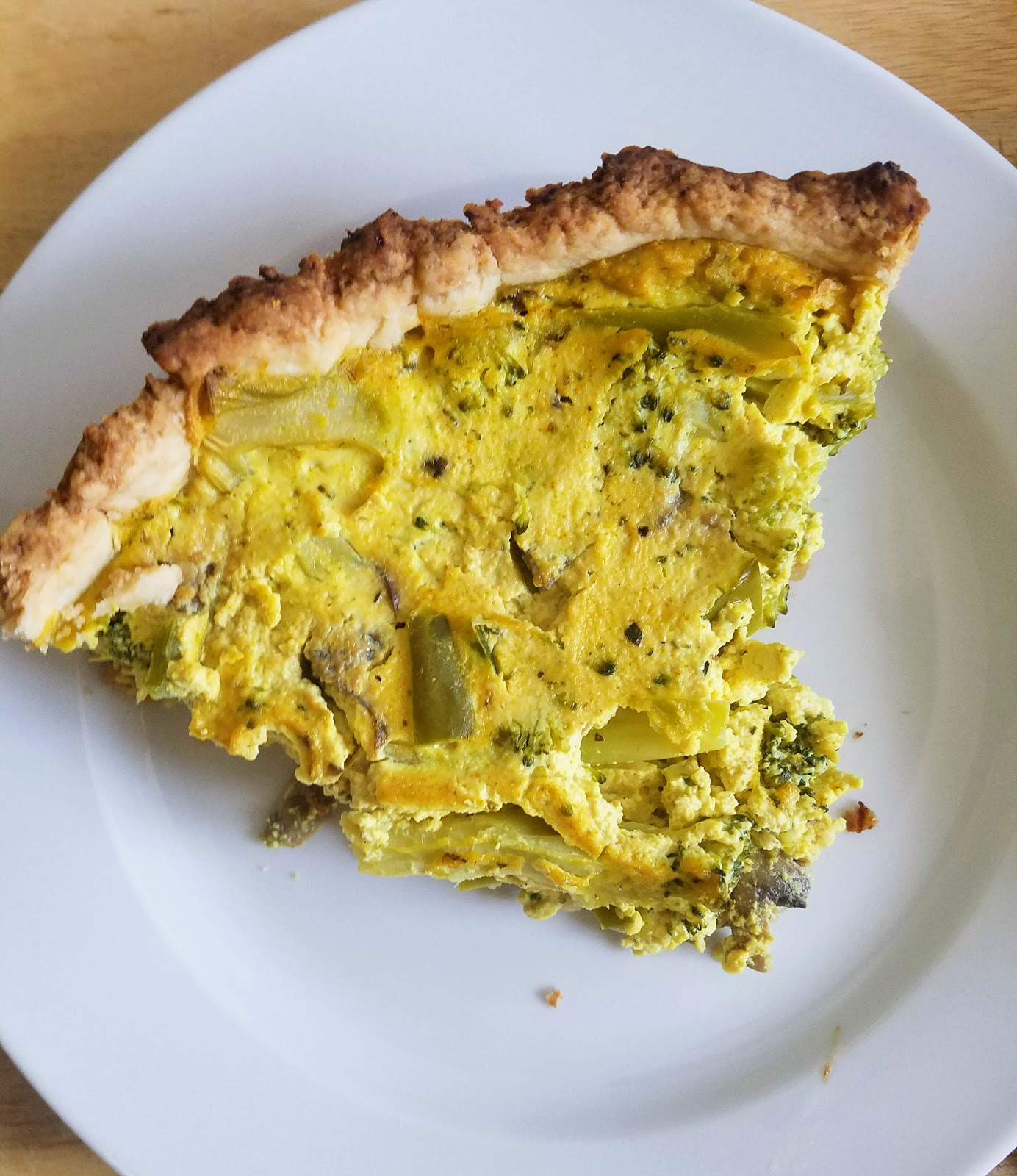 Preheat oven to 425 degrees. Roll out pie crust to about 1/4 inch thickness. Place in pie pan and trim edges. Drain tofu using paper towels and crumble block into food processor. Add non-dairy milk, tumeric, nutmeg, italian seasoning, and salt and pepper, and blend until smooth. Pour tofu mixture into a bowl and fold in chopped vegetables. Transfer to pie pan and even out the top with the back of your spoon. Bake for 45 minutes or until a knife comes out clean and the crust is golden brown. If the crust starts to burn before the quiche is done, place a ring of tinfoil around the edge of the crust to keep it from burning.