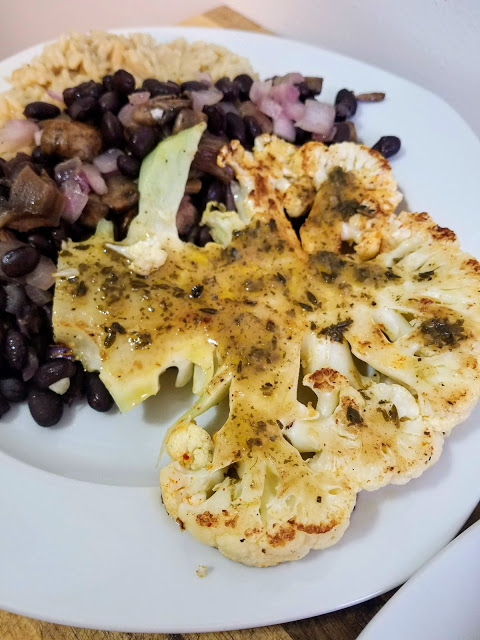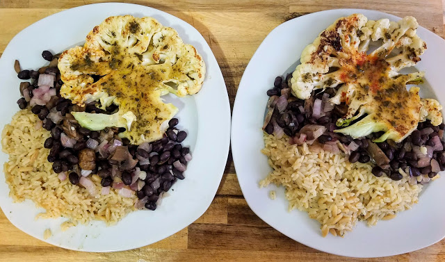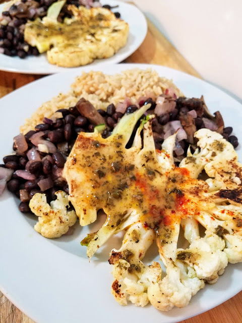 Cook rice pilaf according to the instructions. Meanwhile, saute garlic, red onion, and mushrooms in olive oil over medium high heat until soft and browned. Add black beans, stir, and reduce heat to low (stirring occasionally). Remove outer leaves from cauliflower head and cut in slices, about 3/4 inch thick. Rub both sides of cauliflower with olive oil and sprinkle with salt, pepper, paprika, and garlic powder. Heat a large skillet or grill pan on high heat and place cauliflower steaks in pan. Press down with a spatula for about four minutes on each side, or until browned and a bit charred on the edges. Remove cauliflower steaks from the pan and baste with chimichurri sauce. Serve with rice and bean mixture and top with more chimichurri sauce if desired. Voila!