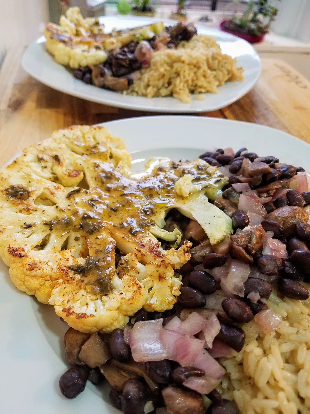 Cook rice pilaf according to the instructions. Meanwhile, saute garlic, red onion, and mushrooms in olive oil over medium high heat until soft and browned. Add black beans, stir, and reduce heat to low (stirring occasionally). Remove outer leaves from cauliflower head and cut in slices, about 3/4 inch thick. Rub both sides of cauliflower with olive oil and sprinkle with salt, pepper, paprika, and garlic powder. Heat a large skillet or grill pan on high heat and place cauliflower steaks in pan. Press down with a spatula for about four minutes on each side, or until browned and a bit charred on the edges. Remove cauliflower steaks from the pan and baste with chimichurri sauce. Serve with rice and bean mixture and top with more chimichurri sauce if desired. Voila!