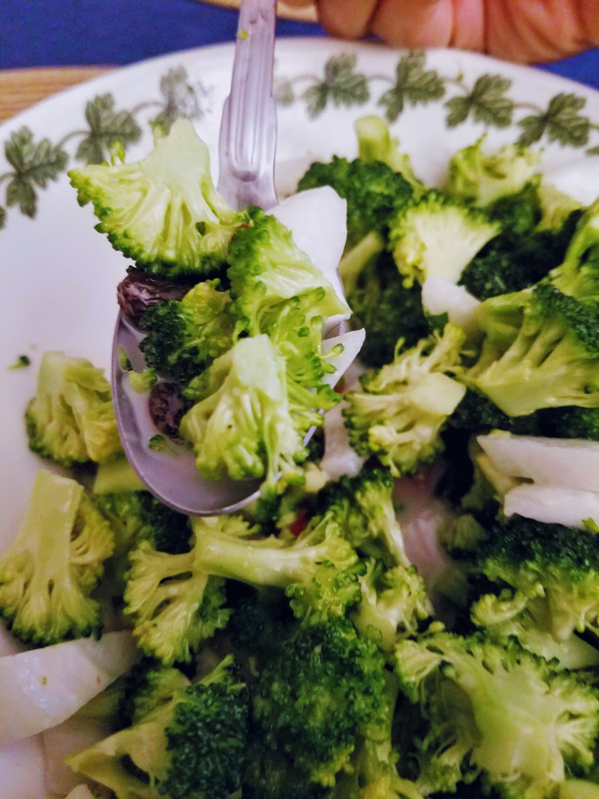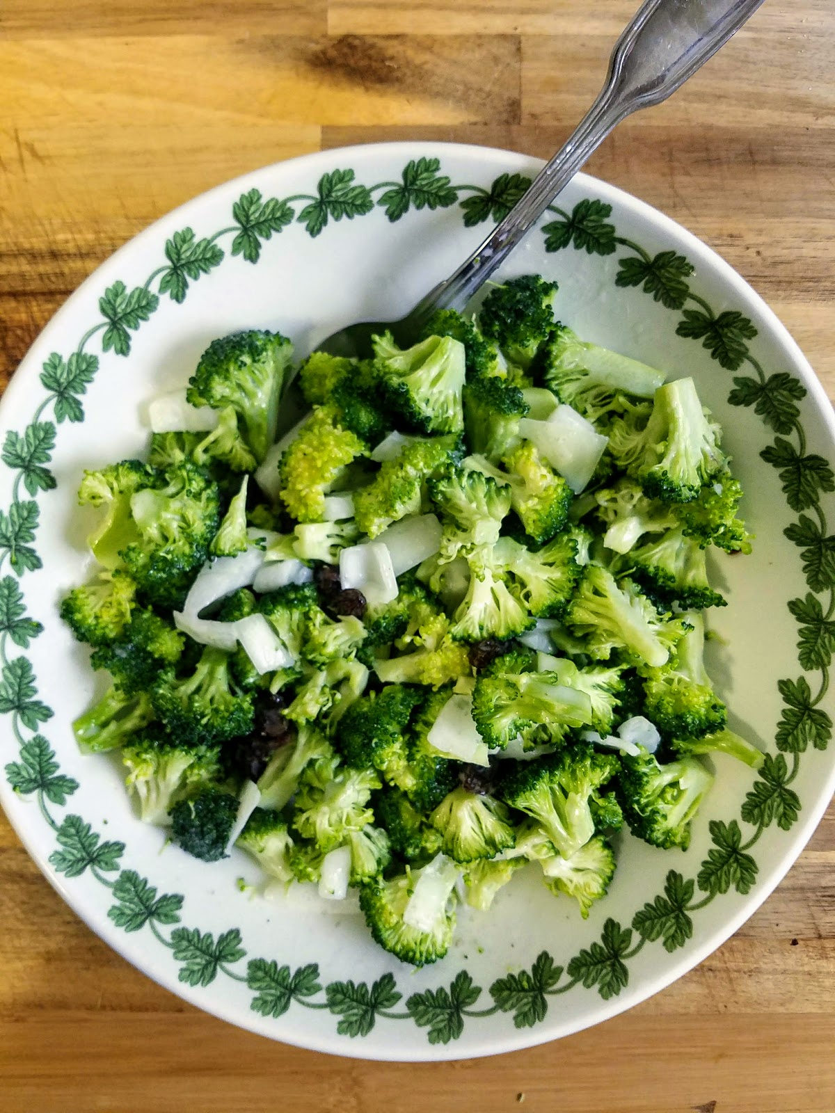 Tonight I was waiting for a friend to call for a catch up, so this was the perfect thing to make for dinner. I whipped it up, popped it in the fridge while I was on the phone, and then dished it up and enjoyed after we hung up. It also is a yummy lunch option if you make a extra and store in the fridge (just make sure your tupperware is leak-proof! I’m scarred for life!). Broccoli salad is one of those things that keeps getting better with time.