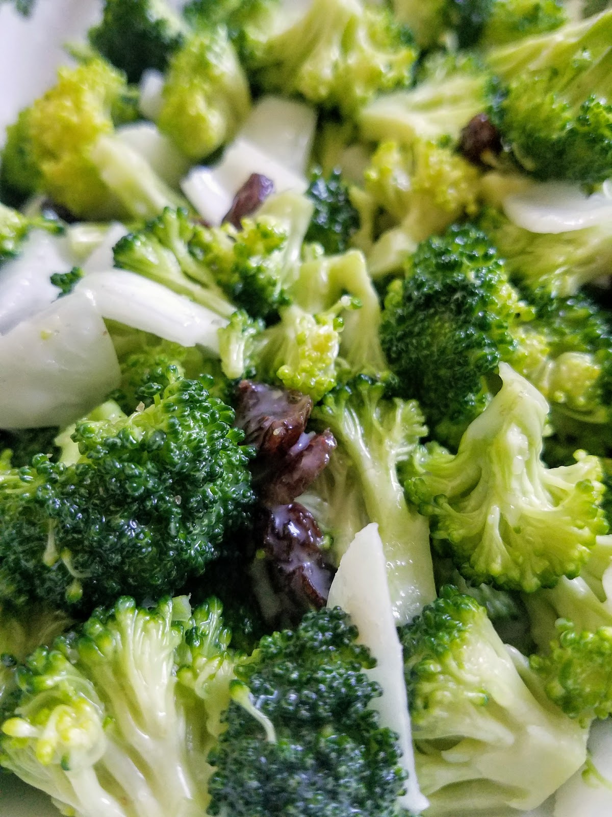 I’m adding this recipe to my list of favorite summer salads because this broccoli salad is amazing. You refrigerate it for at least an hour to make sure the dressing works its magic and infuses the sweet, sour, and salty flavors into the raw broccoli florets. And because it is served cold, it is so refreshing and crisp on a hot summer day. The broccoli gets softened by the dressing but still stays a bit firm for a little bit of crunch. This salad was always my mom’s contribution to church potluck luncheons. I can remember it sitting in the fridge a day ahead of time; my anticipation would rise every time I opened the fridge door and saw it there, marinating, waiting to be enjoyed by our friends and family the next afternoon.