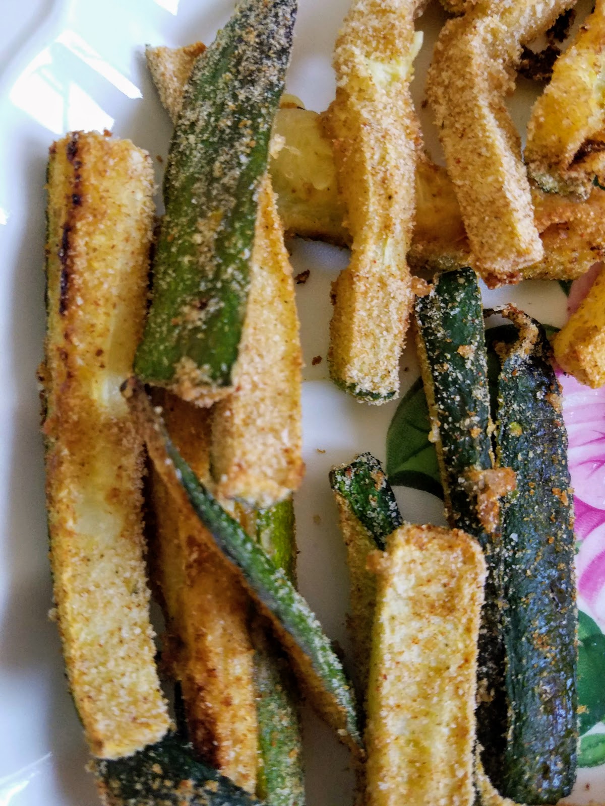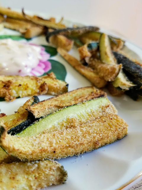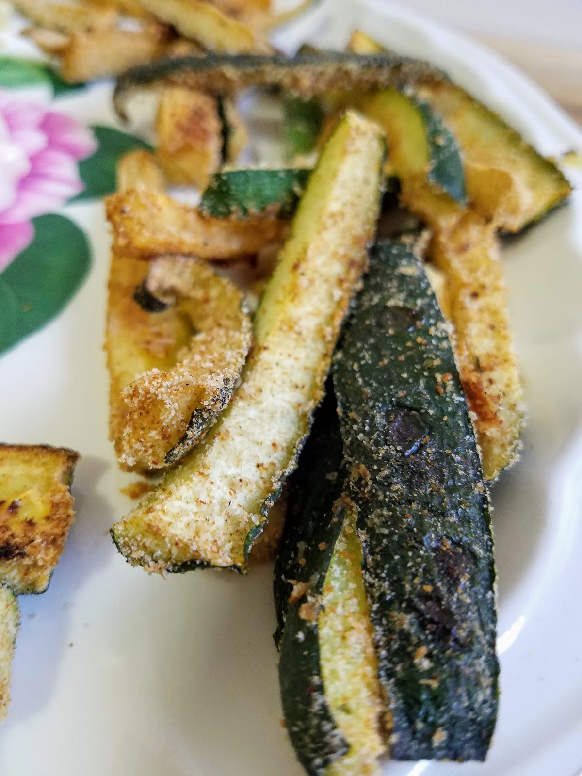 Preheat oven to 375 degrees. Slice the zucchini in half width-wise, and then again in half lengthwise. Then slice into small strips – the smaller the fries the crispier they get. Put bread crumbs, paprika, and garlic powder in a large plastic baggie. Add a handful of zucchini strips at a time and shake in the bread crumb mixture until coated. Repeat until all the strips are coated. Place zucchini strips on a lightly greased cookie sheet – not too close together or else they won’t get crispy. Cook for 8 minutes, flip, and then 8 minutes more, and then 2-3 minutes under the broiler for a final crisping. Serve with some sriracha mayo or ketchup.