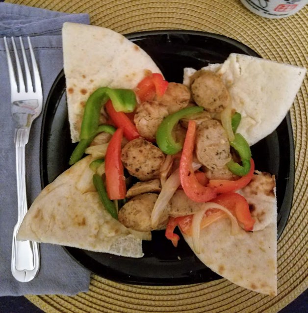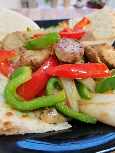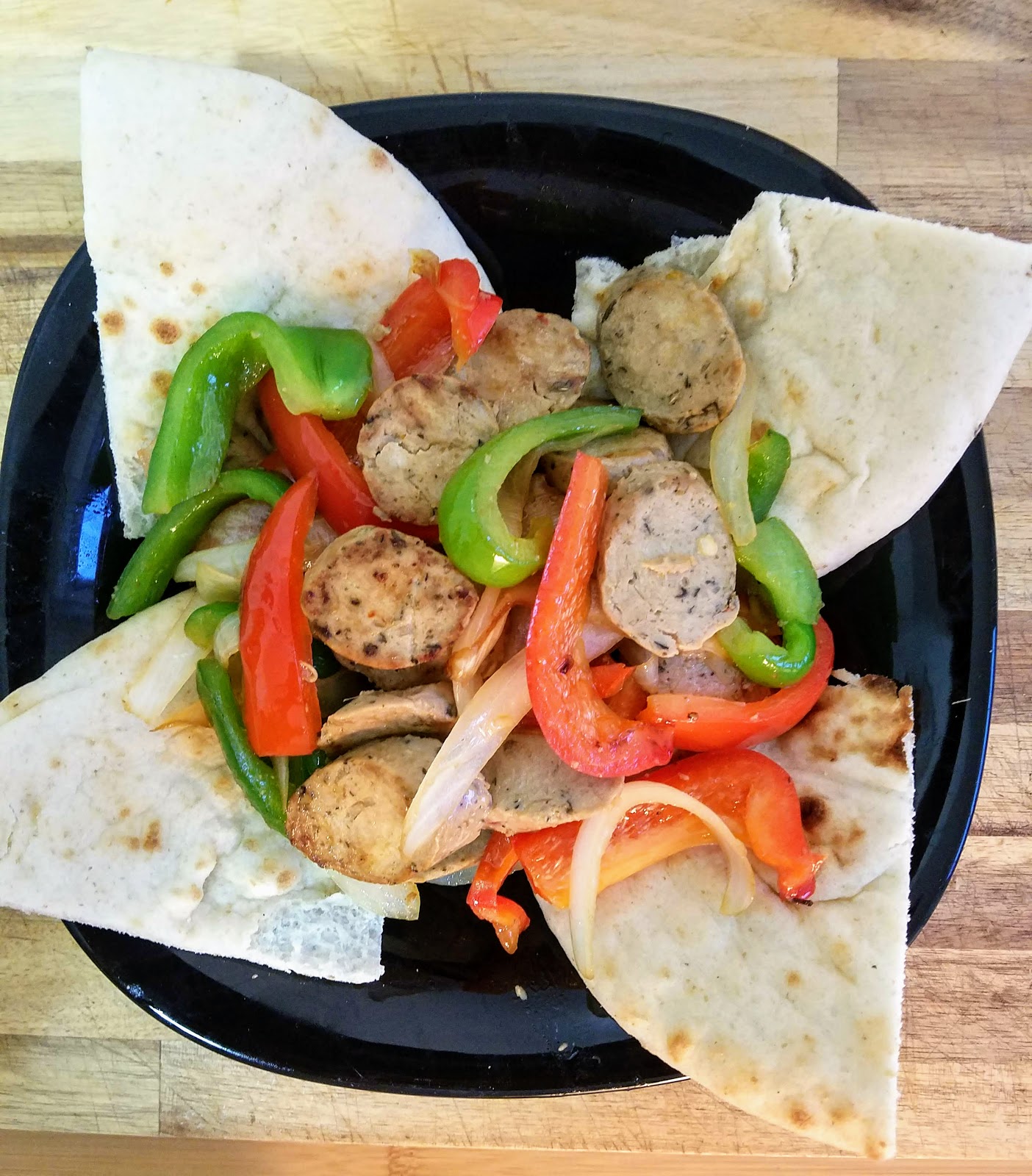 Slice peppers and onions into thin slices, and mince garlic clove. Heat up 2 Tbsp olive oil in a large skillet over medium high heat. Add onions, peppers, and garlic, and sprinkle with salt and pepper. Saute for about 5-6 minutes or until peppers are soft and the onion is starting to brown. Add sliced sausages and cook for another 2-3 minutes or until sausage starts to brown on the edges. Stir less frequently to allow sausages to crisp up a little bit. Serve on a roll or in a pita pocket (or with pinwheel pita corners apparently!) as you wish.
