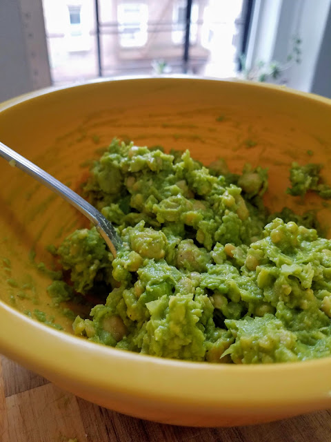 Add drained chickpeas and chopped avocado to a bowl. Use a fork to mash together until most of the chickpeas and all of the avocado are completely mashed. I like to leave a little texture in the chickpeas rather than making it completely smooth. Then, add fresh cracked salt and pepper to taste and mix it in.