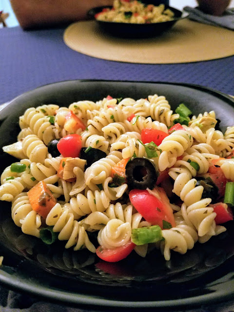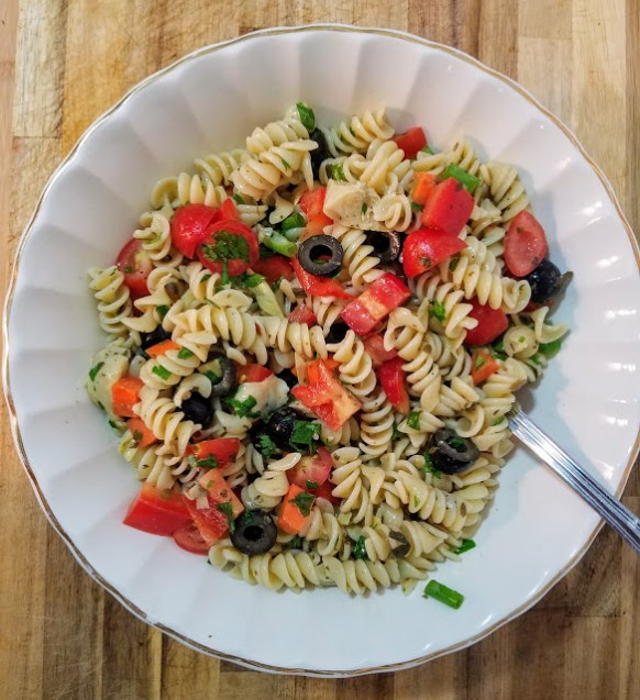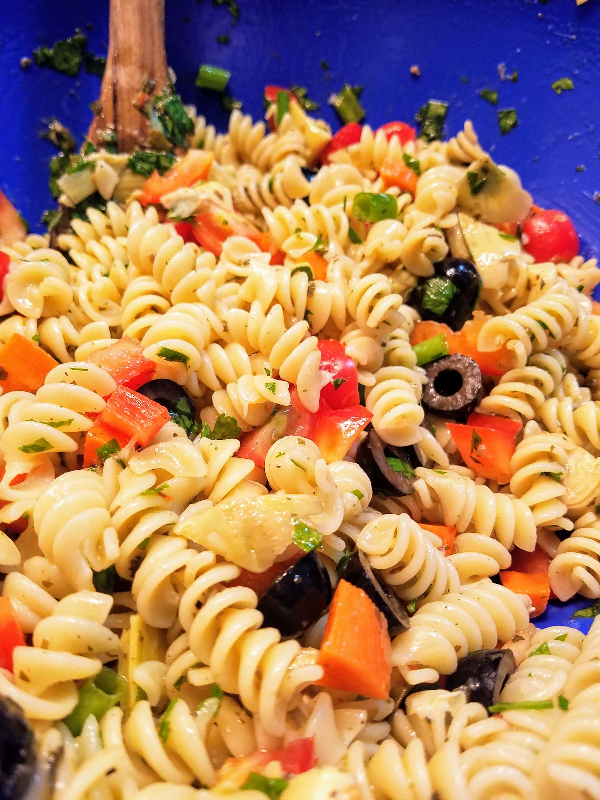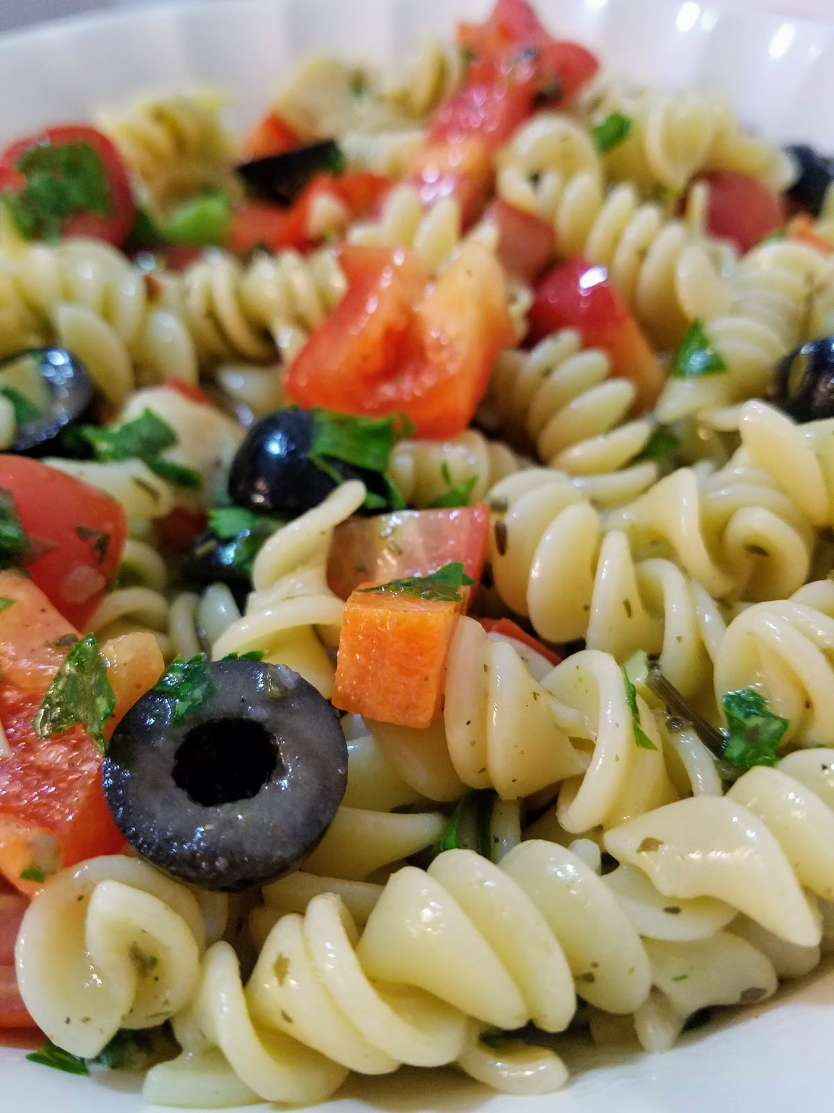 For this pasta salad I used a chimichurri marinade that I had leftover in my fridge from when I made cauliflower steaks. It’s basically a mixture of olive oil, fresh parsley and cilantro, chopped garlic, and red wine vinegar processed in a food processor. If you can’t find this chimichurri marinade in the store you can always improvise and make your own or use italian dressing. I add an extra drizzle of olive oil and lemon juice to my dressing to give it an extra zing of flavor; I found that it gave it more body. Feel free to also experiment with adding garlic and onion powders or other flavors that appeal to you. Enjoy!