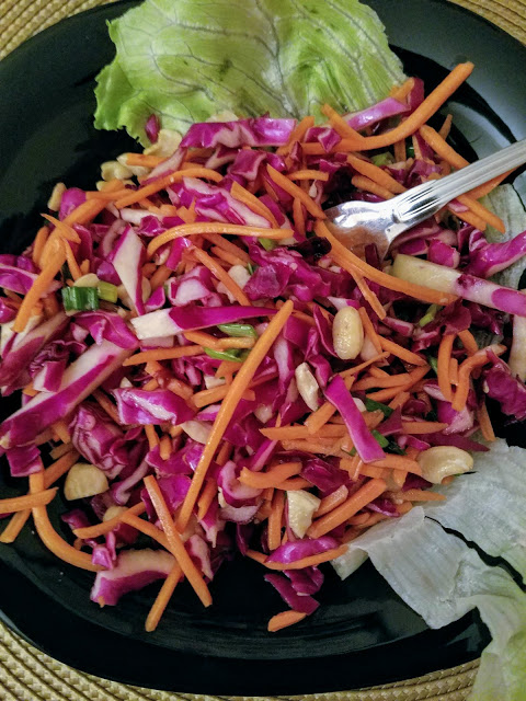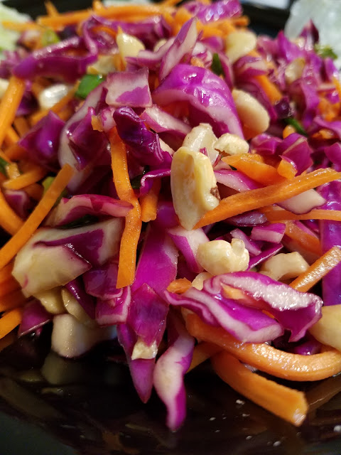 This Asian slaw would make a great side dish to some barbecued tofu, delicious on top of a banh mi or a veggie dog, or a yummy light lunch or dinner on its own. You could substitute peanuts for cashews if you’d like, and/or whisk in a tablespoon or two of peanut butter into the sauce for a chili peanut sauce flavor. Just make sure to enjoy that gorgeous color of the red cabbage – it’s one of nature’s finest creations!