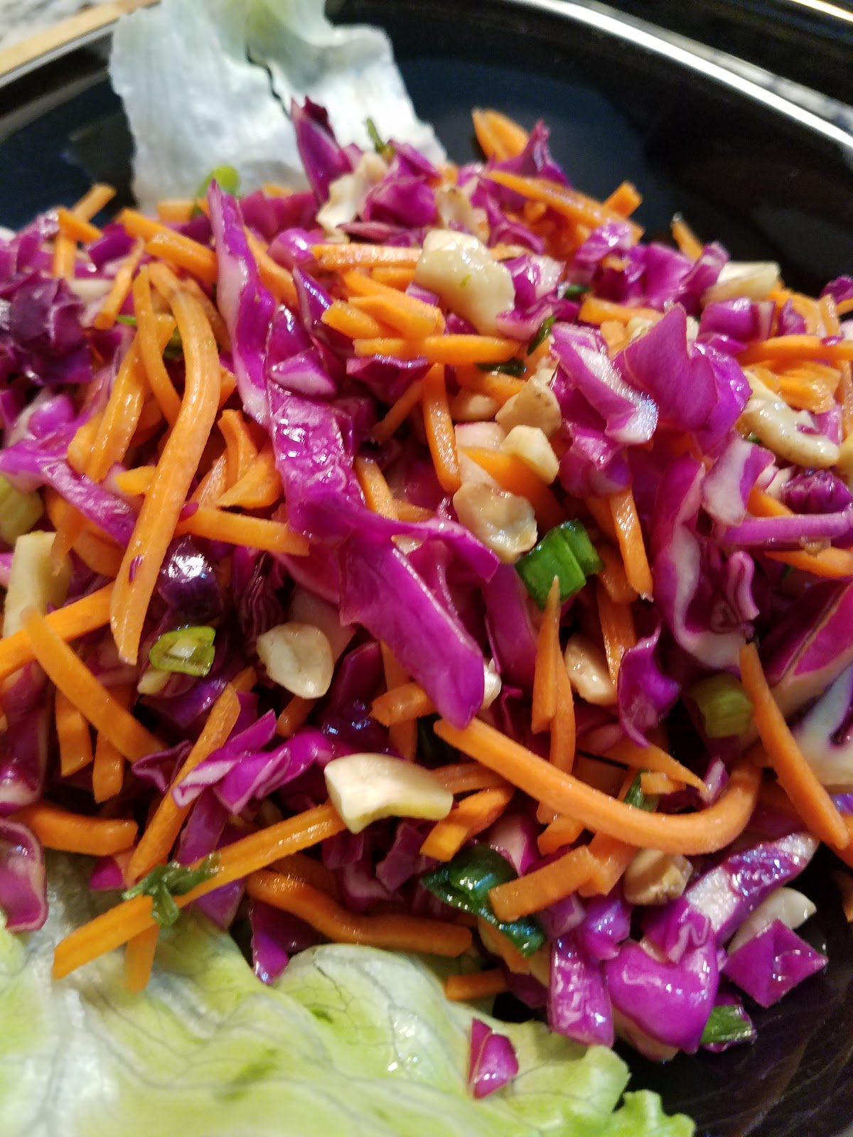 Cole slaw is such a summer staple, isn’t it? Sometimes I miss the creamy and refreshing taste of cole slaw and am grateful for the availability of very good vegan versions. This recipe is a variation on tradition cole slaw for something new and different using Asian flavors. I decided to omit the vegannaise in the recipe, but I have also tried adding 1/4 cup of vegan mayo to it as well; that was very yummy if you’re going for a more traditionally creamy texture. For this version I wanted to keep it low calorie, chunky and textured, and fresh and healthy. And it’s just that!