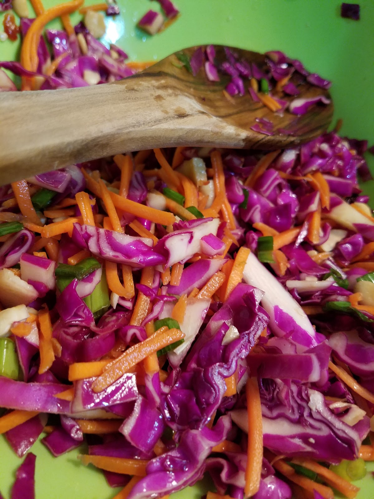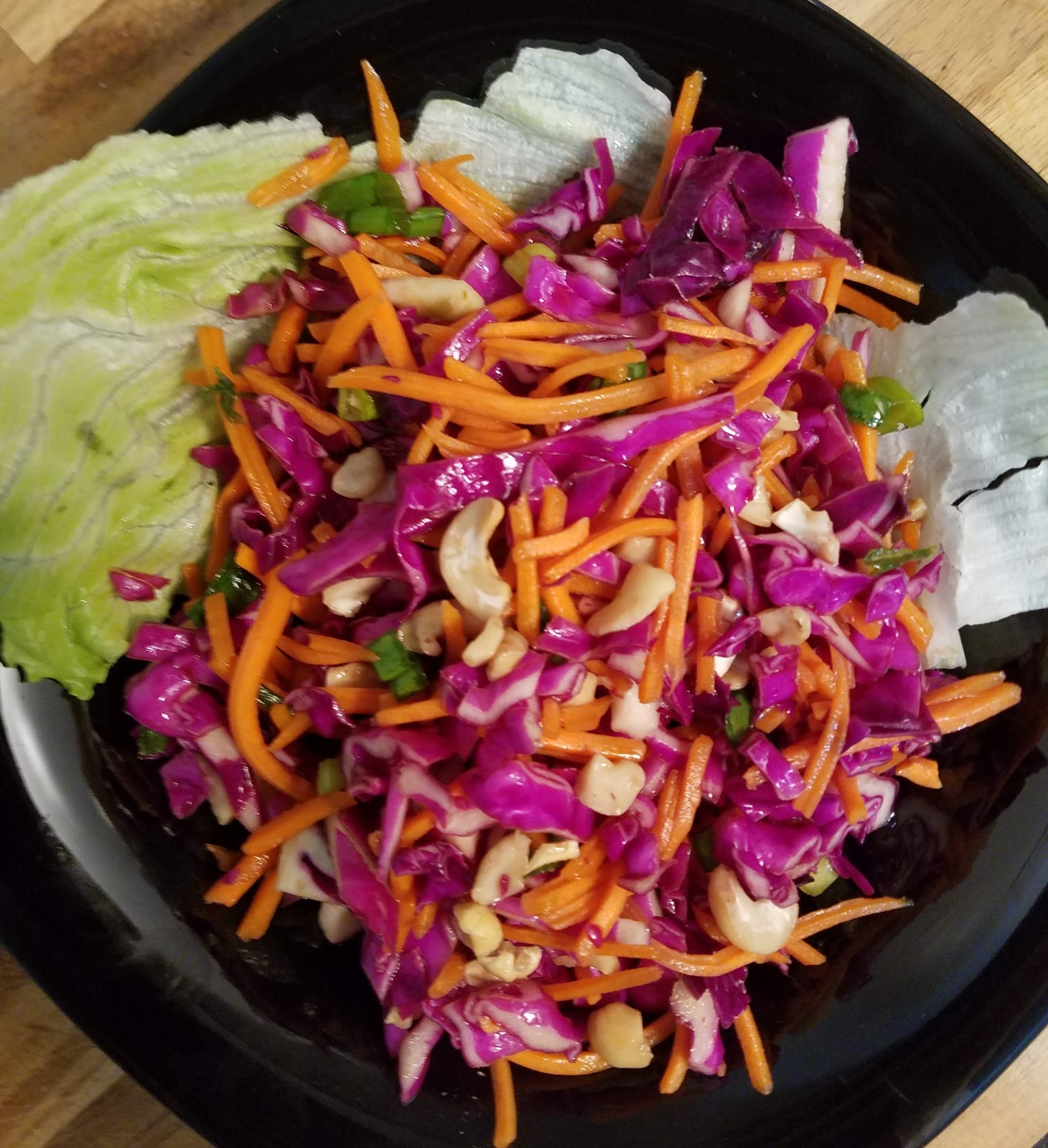 This Asian slaw would make a great side dish to some barbecued tofu, delicious on top of a banh mi or a veggie dog, or a yummy light lunch or dinner on its own. You could substitute peanuts for cashews if you’d like, and/or whisk in a tablespoon or two of peanut butter into the sauce for a chili peanut sauce flavor. Just make sure to enjoy that gorgeous color of the red cabbage – it’s one of nature’s finest creations!