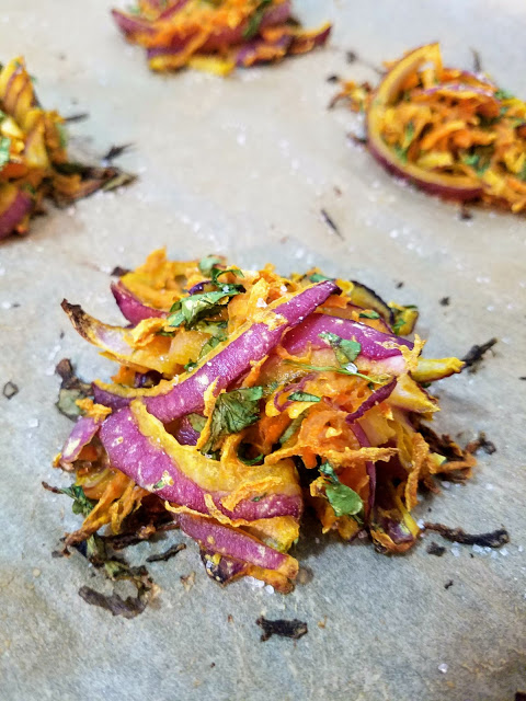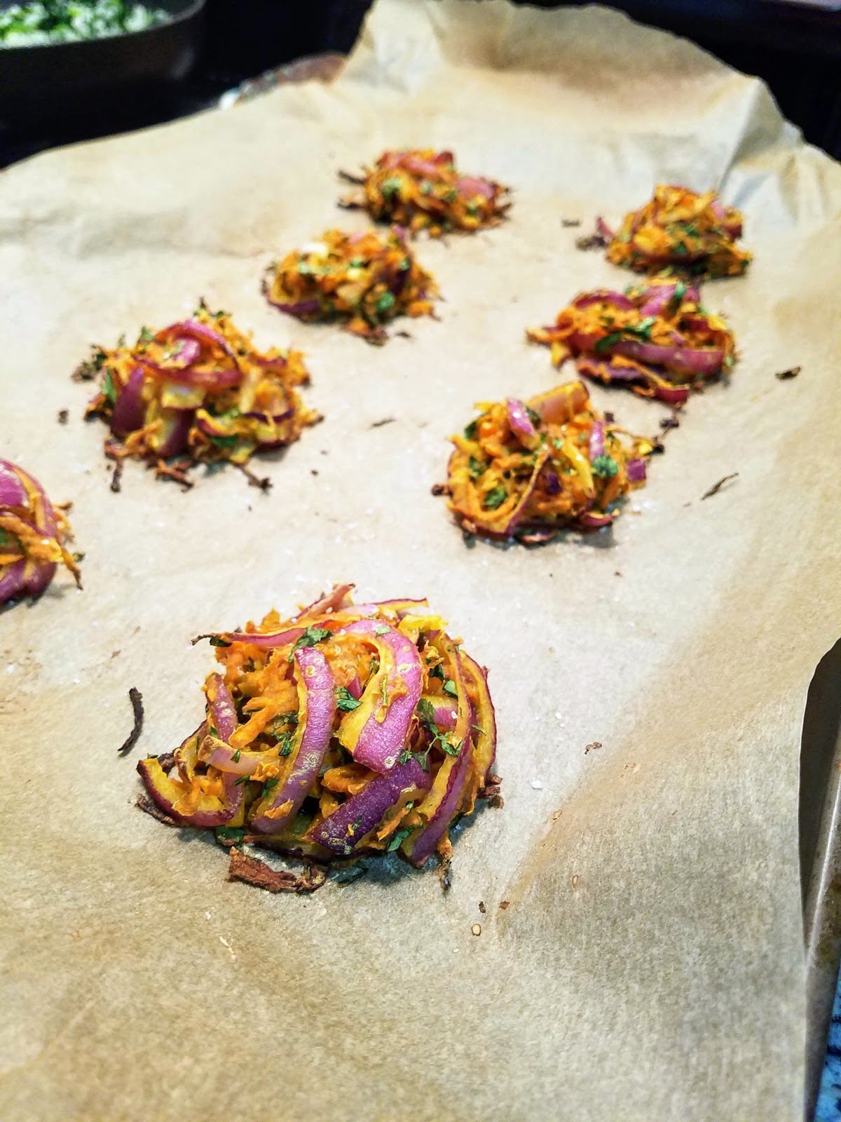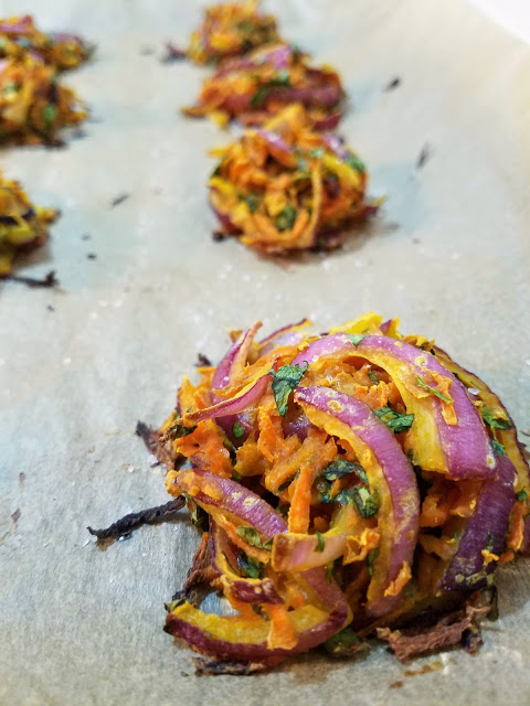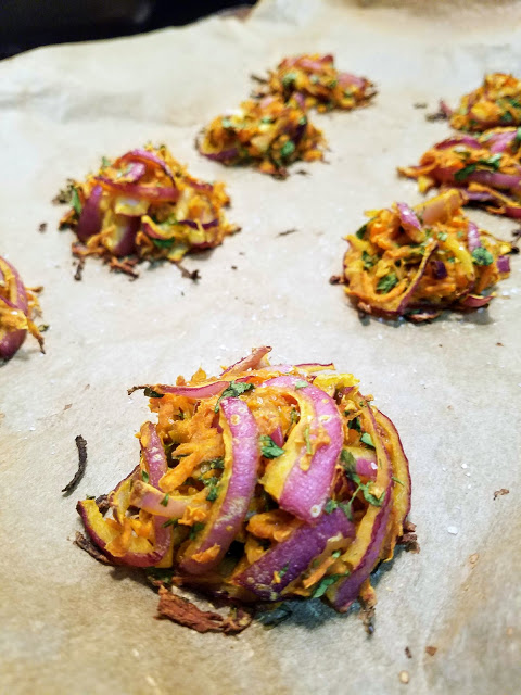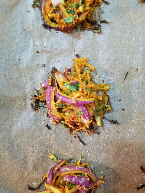 Preheat oven to 400 degrees. Place prepped onions and carrots in a large mixing bowl and salt generously. Set aside for 5-10 minutes. Meanwhile, prep the garlic, chile, and cilantro. Add remaining ingredients to bowl and mix together until incorporated. If it’s too wet, add more flour. If it’s too dry, add more water. Form mixture into balls the size of golf balls and place onto a cookie sheet lined with parchment paper. Bake for 20 minutes, carefully turning halfway through (if they are sturdy enough – mine weren’t). They should be brown and crispy, especially around the edges! Sprinkle with salt when they come out of the oven and serve immediately.
