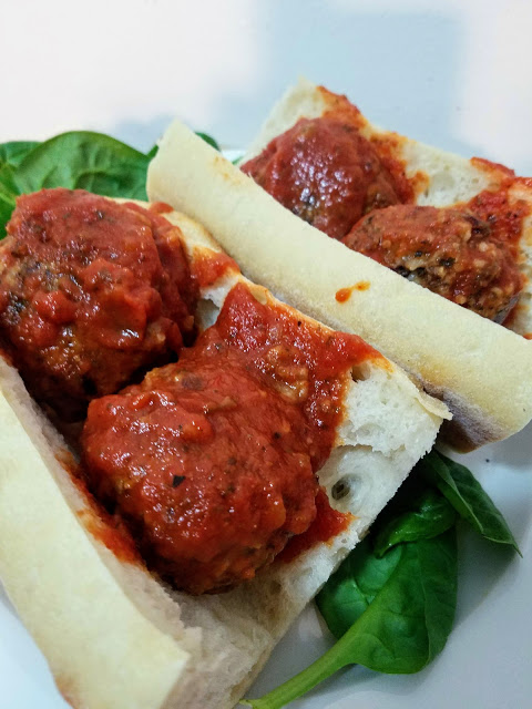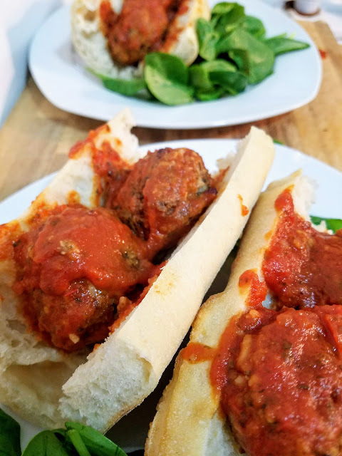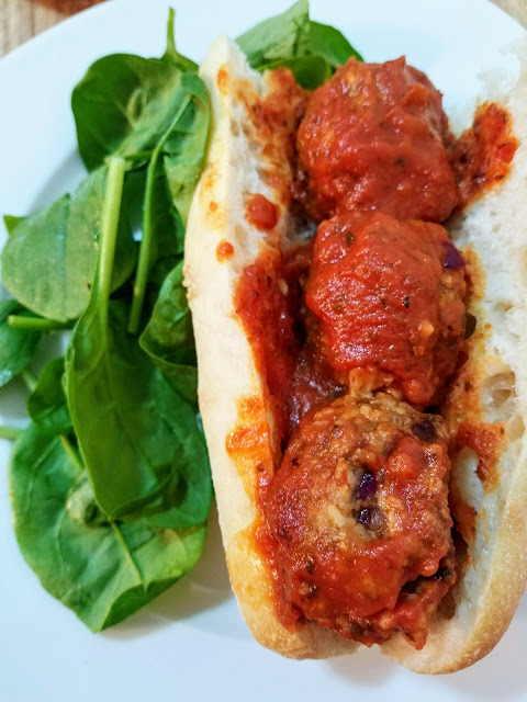 The base of the ball is mushroom, onion, and garlic, and it is bound together with cooked rice, flour, and bread crumbs. It’s seasoned with Italian seasoning and crushed red pepper, and slathered in tomato sauce. Sandwich them in a baguette and you’ve got yourself a beautiful sandwich! Keep pre-made meatballs in the freezer and heat them back up the oven whenever you’re craving this meatball sub. Great for lunch or dinner or even a midnight snack.