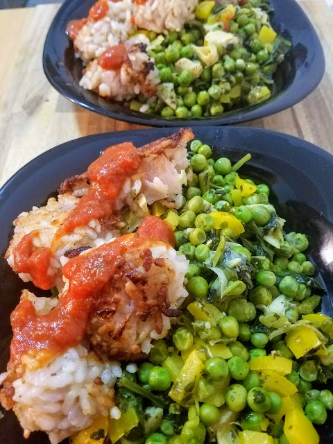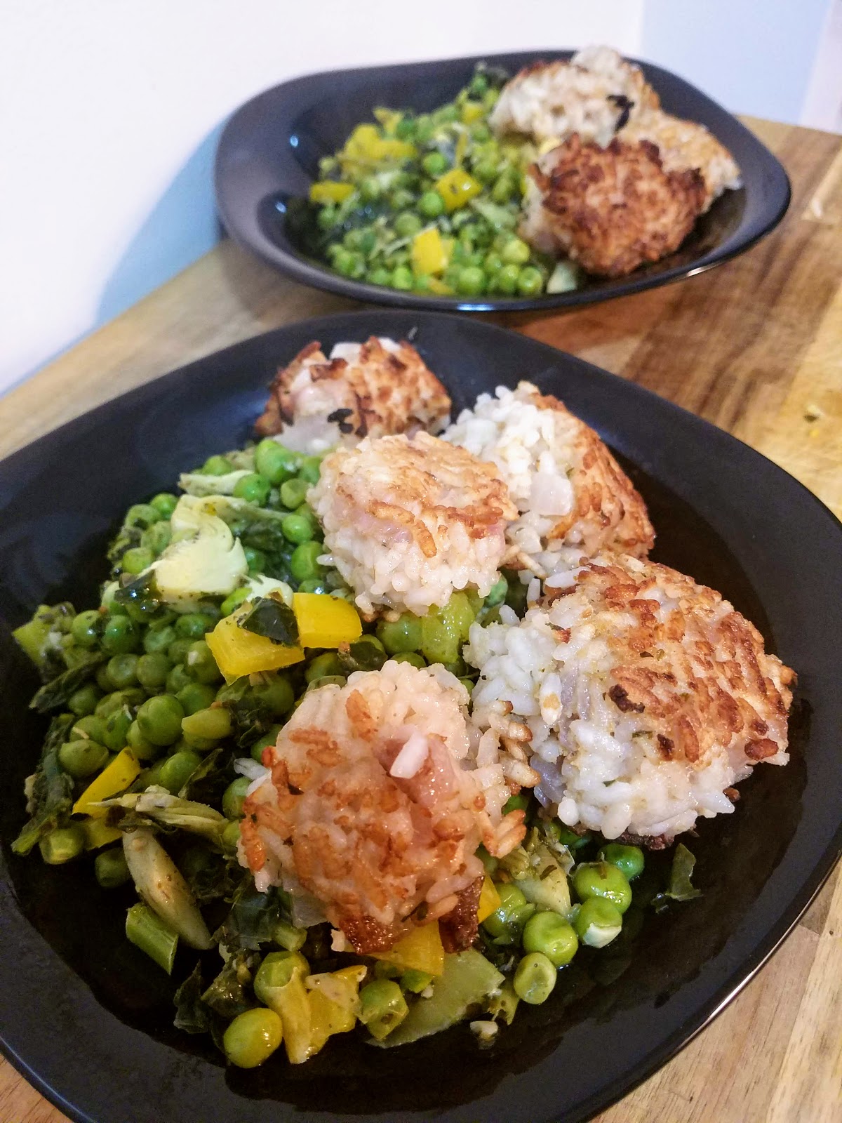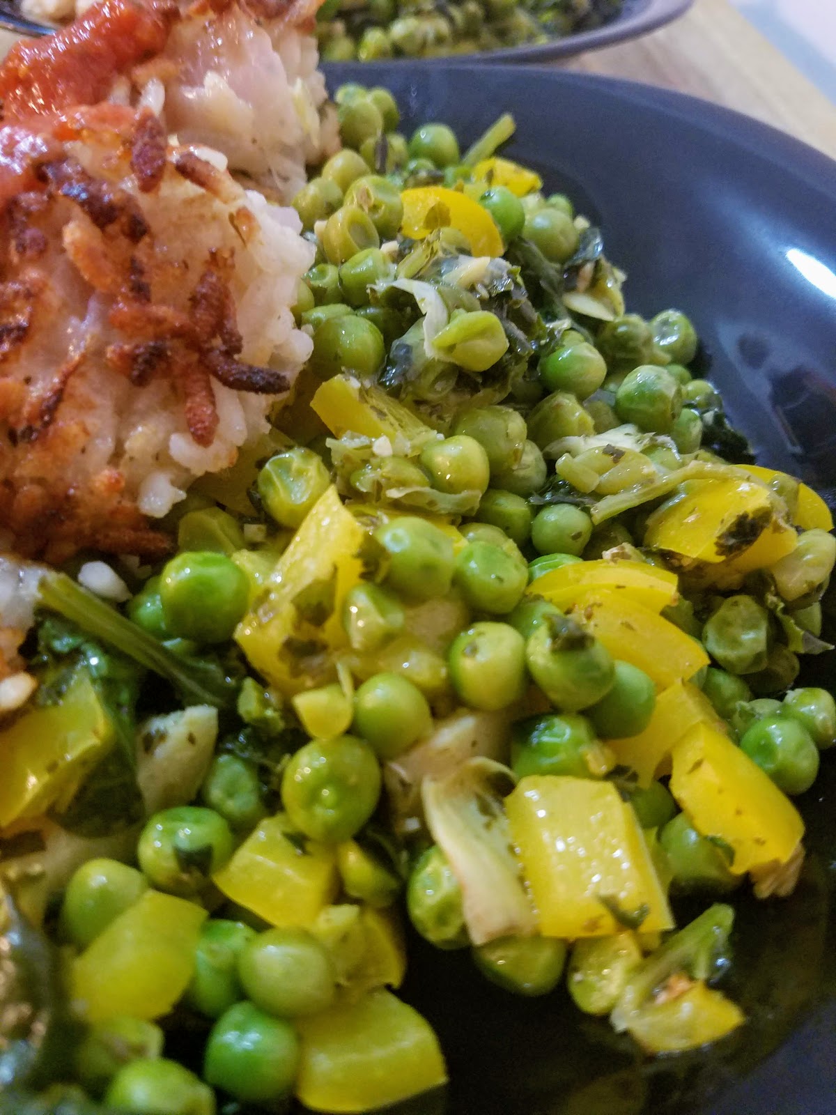 Next I grabbed a bag of frozen peas and dressed them up with pesto and other veggies and greens. I topped the twice cooked risotto with a bit of marinara sauce. The red sauce and the pesto worked perfectly together, and the crunchy risotto worked well with the cooked peas. We were both so excited about how it turned out and were desperate for seconds!