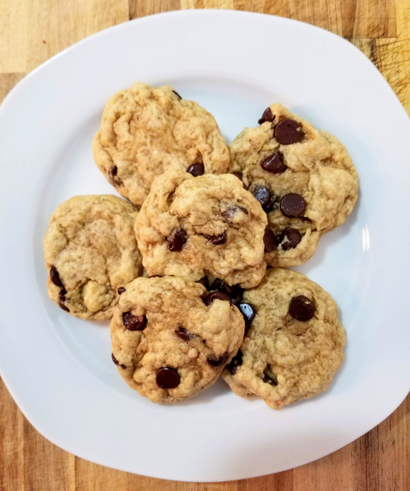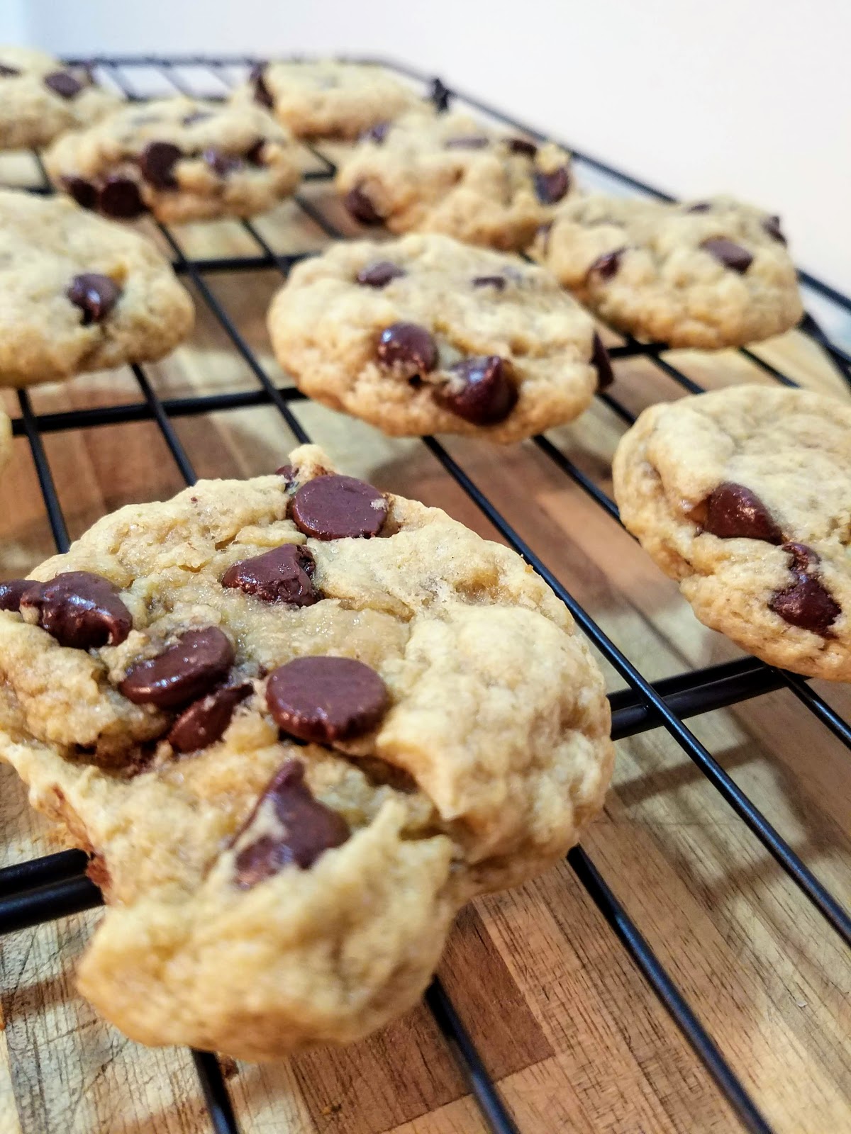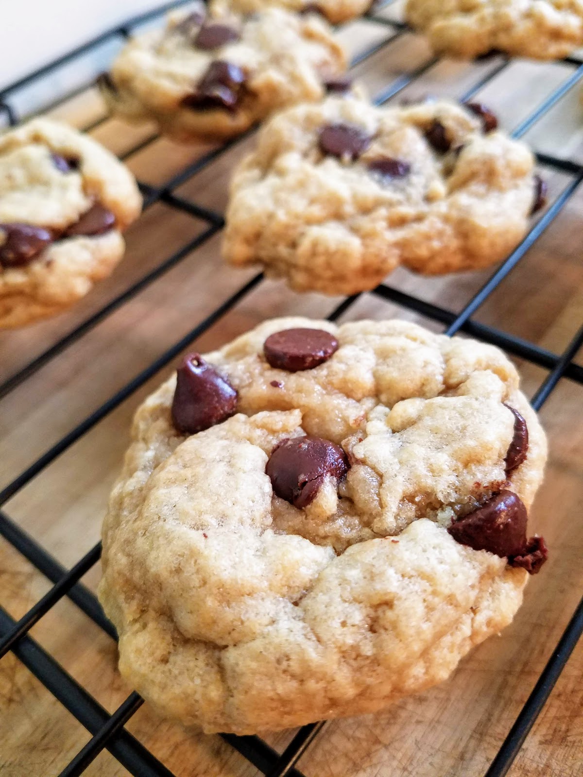 In a large mixing bowl, mix dry ingredients together. Then add wet ingredients and mix well until it resembles a cookie dough. If it is too dry after mixing, add another tablespoon of non-dairy milk and mix. Fold in chocolate chips with your hands and form dough into a ball. Wrap in plastic wrap and refrigerate for 2 hours or freeze for 30 minutes (until dough is cold). Preheat oven to 325 degrees. Roll dough into balls 1 inch in diameter – you should get about 11 or 12 cookies and place on a well-greased cookie sheet. Bake for 11 minutes and let cool for 10 minutes. They might not look completely done when you take them out of the oven but they will firm up while cooling. If they haven’t spread enough, you can press them down with the back of a spoon when first out of the oven.