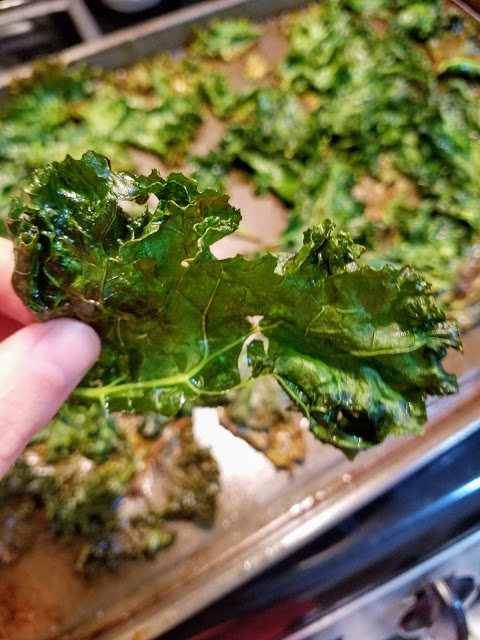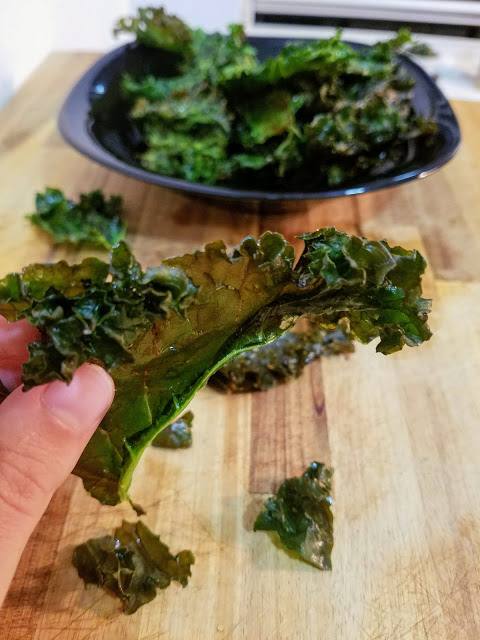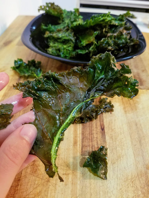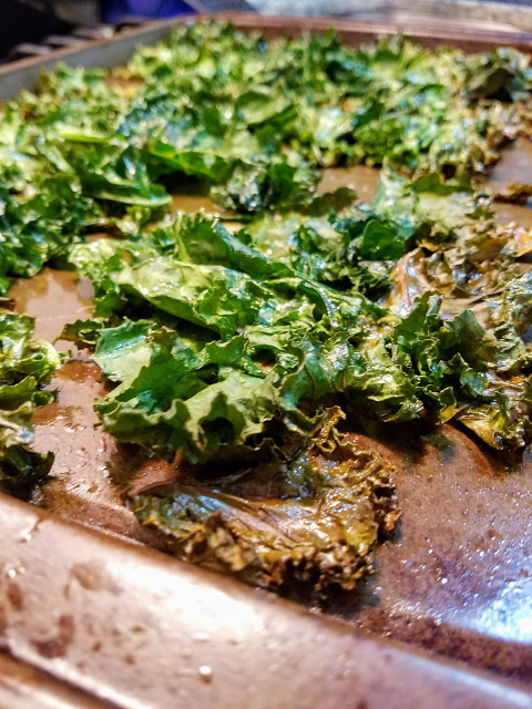 One thing to keep in mind is that kale chips don’t stay crunchy in airtight tupperware or plastic baggies, so they have to be eaten within a few hours of when they are made or else they get soft and chewy. And also make note that the kale cooks down to about 1/3 the size, so make sure to fill up your baking sheet with what looks like too much kale because it will cook down to about 1-2 servings. These chips are fresh, delicious, crunchy, salty, and healthy. Enjoy!
