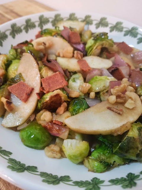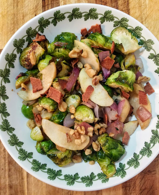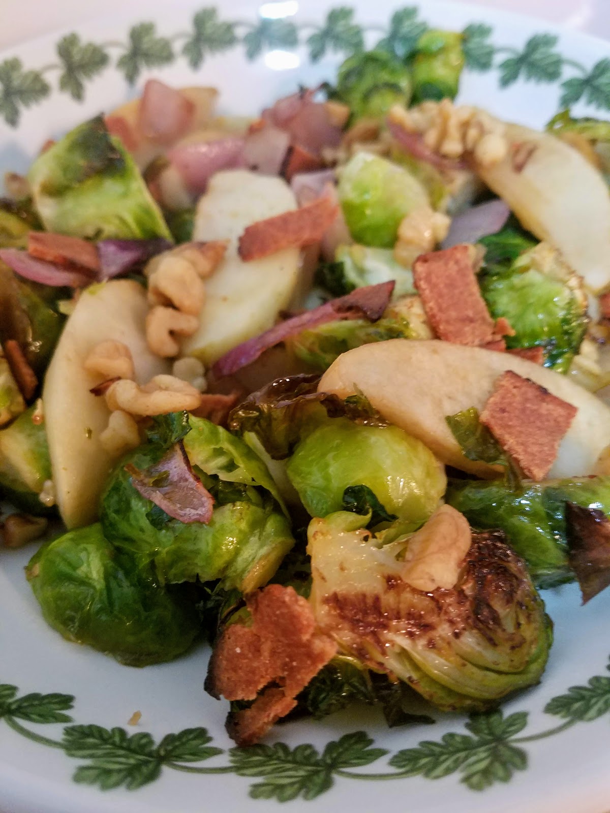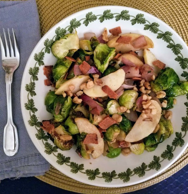 Preheat oven to 375 degrees. Place chopped Brussel sprouts, chopped red onion, and sliced apples on a baking sheet, and drizzle generously with olive oil and salt. Toss with your hands to evenly coat. Roast in the oven for 25 minutes, tossing halfway through. In the last 3-4 minutes of cooking, drizzle balsamic vinegar over the vegetables and gently toss. Meanwhile, cook strips of bacon in a small skillet on medium high for 2 minutes on each side or until the sides are browned and crispy. Let cool slightly and then chop into bits. After removing the vegetables from the oven, fold in chopped walnuts and bacon bits and serve immediately.