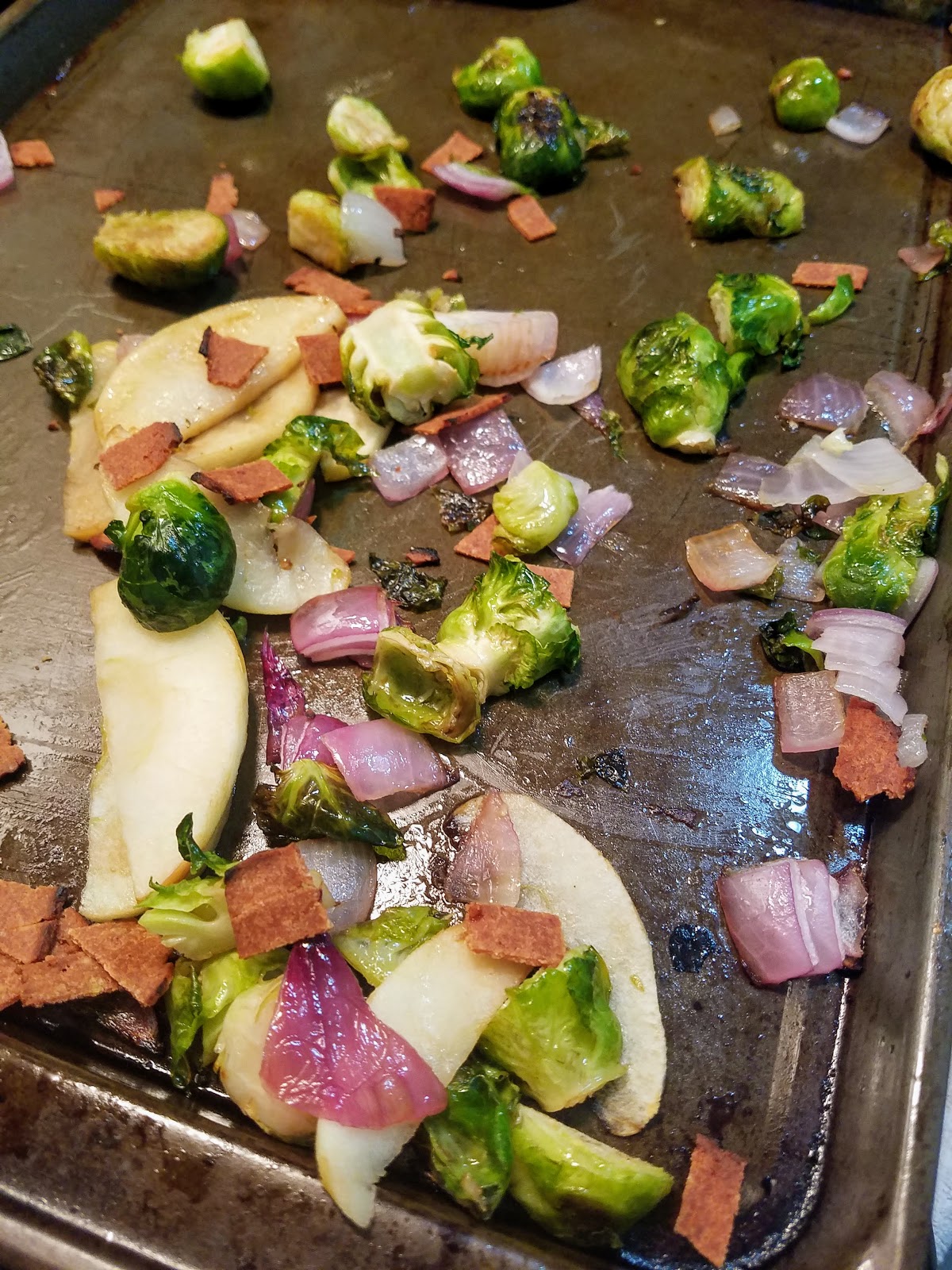 This meal is SO fall. Roasted Brussel sprouts with apple, red onion, walnuts, fake bacon bits, balsamic….need I say more?! The flavors all blend together so sweetly as the sprouts, onions, and apples all brown and caramelize in the oven. A splash of balsamic vinegar complements the sweet, roasted veggies and brings it all together as the final touch. Add some crunch and saltiness from the walnuts and bacon bits, and you have yourself a delightful Autumnal dish!