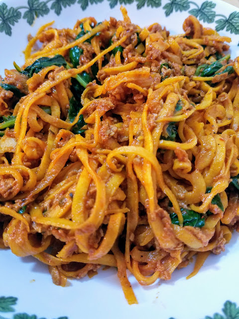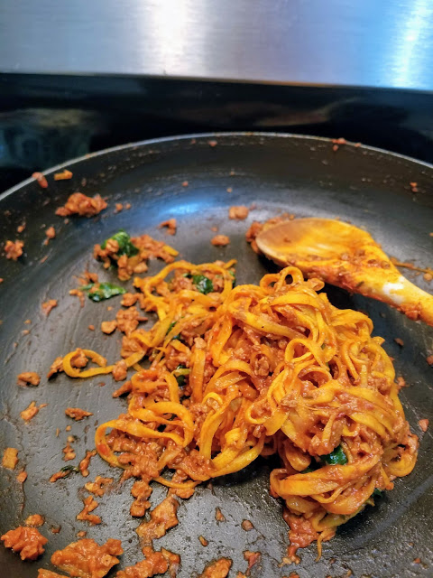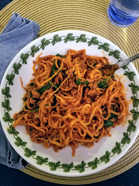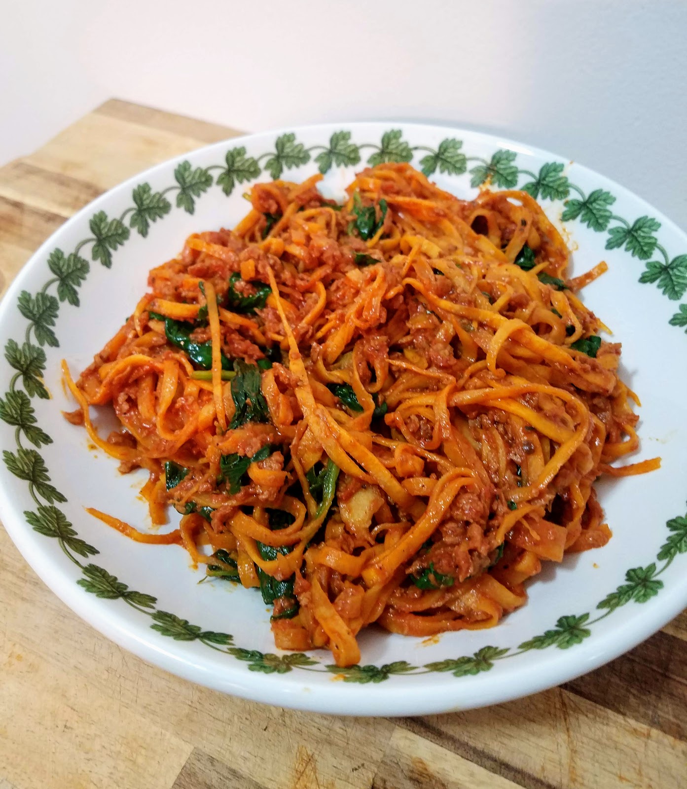 The sauce goes perfectly on butternut squash noodles, which are light and nutrient-rich but hearty enough to handle this thick, “meat” sauce.