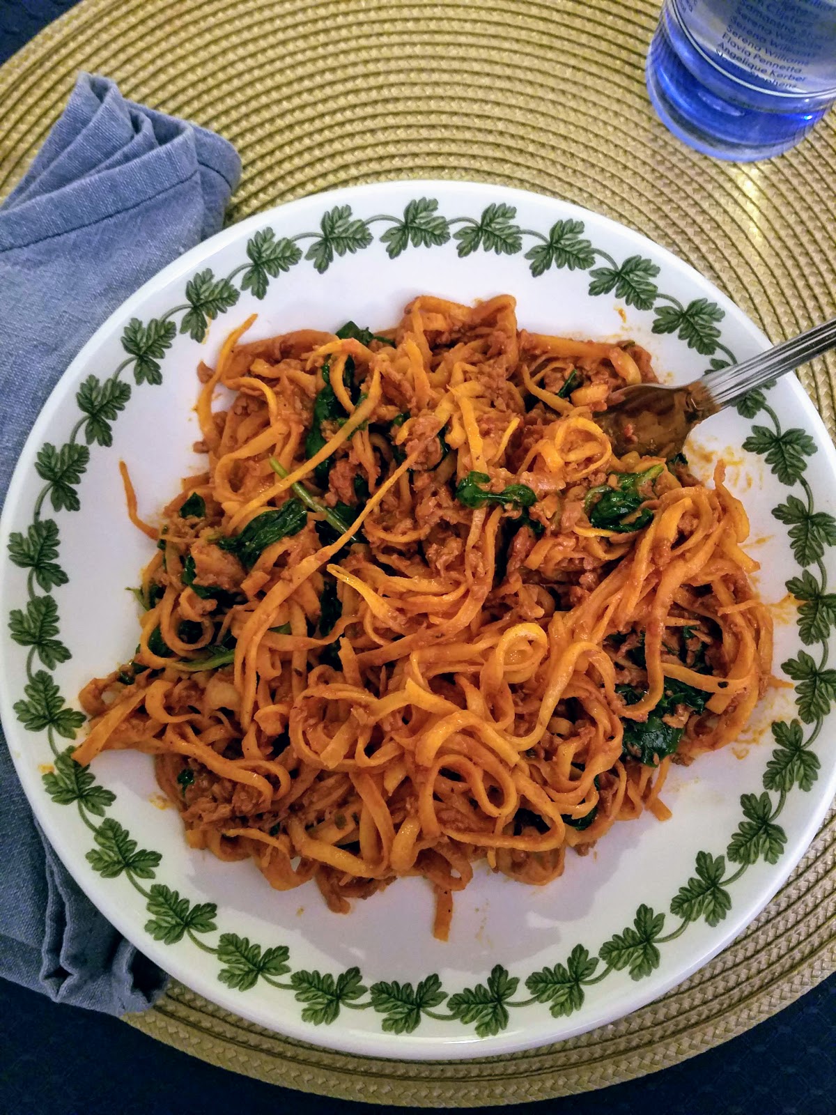 Heat a skillet over medium high heat and add 2 Tbsp olive oil. Crumble the chorizo into the olive oil and cook until warmed through. Add the marinara sauce and stir to combine, cooking for another 2-3 minutes. Next add the baby spinach and fold into the sauce until wilted. Incorporate the noodles into the sauce until fully coated. Once everything is warmed through, it’s ready to serve!