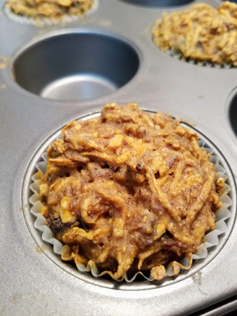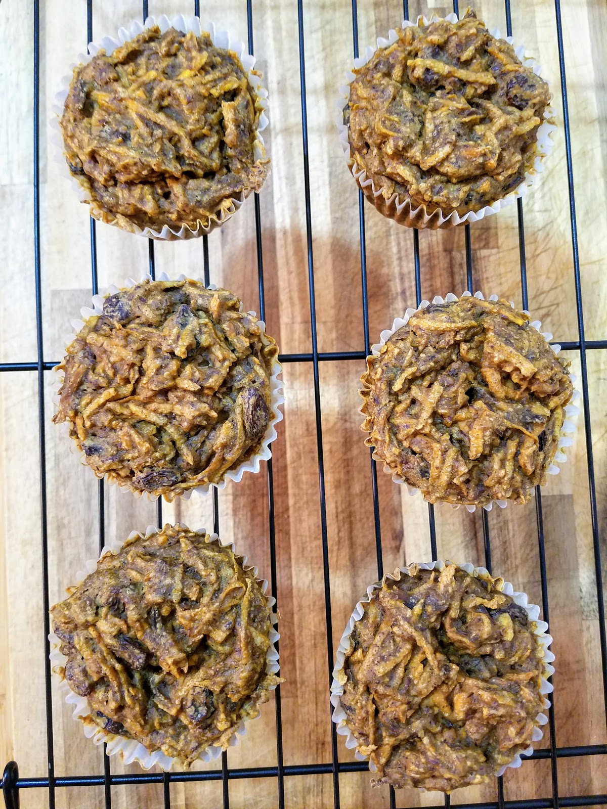 Preheat oven to 375 degrees. Line six cups of a muffin tin with paper liners. Place flour, baking powder, baking soda, salt, and spices in a large mixing bowl and whisk together. In a separate bowl, mix together the flax egg, almond milk, olive oil, maple syrup, and vanilla. Add the dry ingredients to the wet ingredients and stir. Gently fold in the sweet potatoes and raisins. Divide the batter between the muffin cups, filling the cups to the top. Bake 35-40 minutes or until a toothpick comes out clean. Cool for at least 15 minutes before eating.