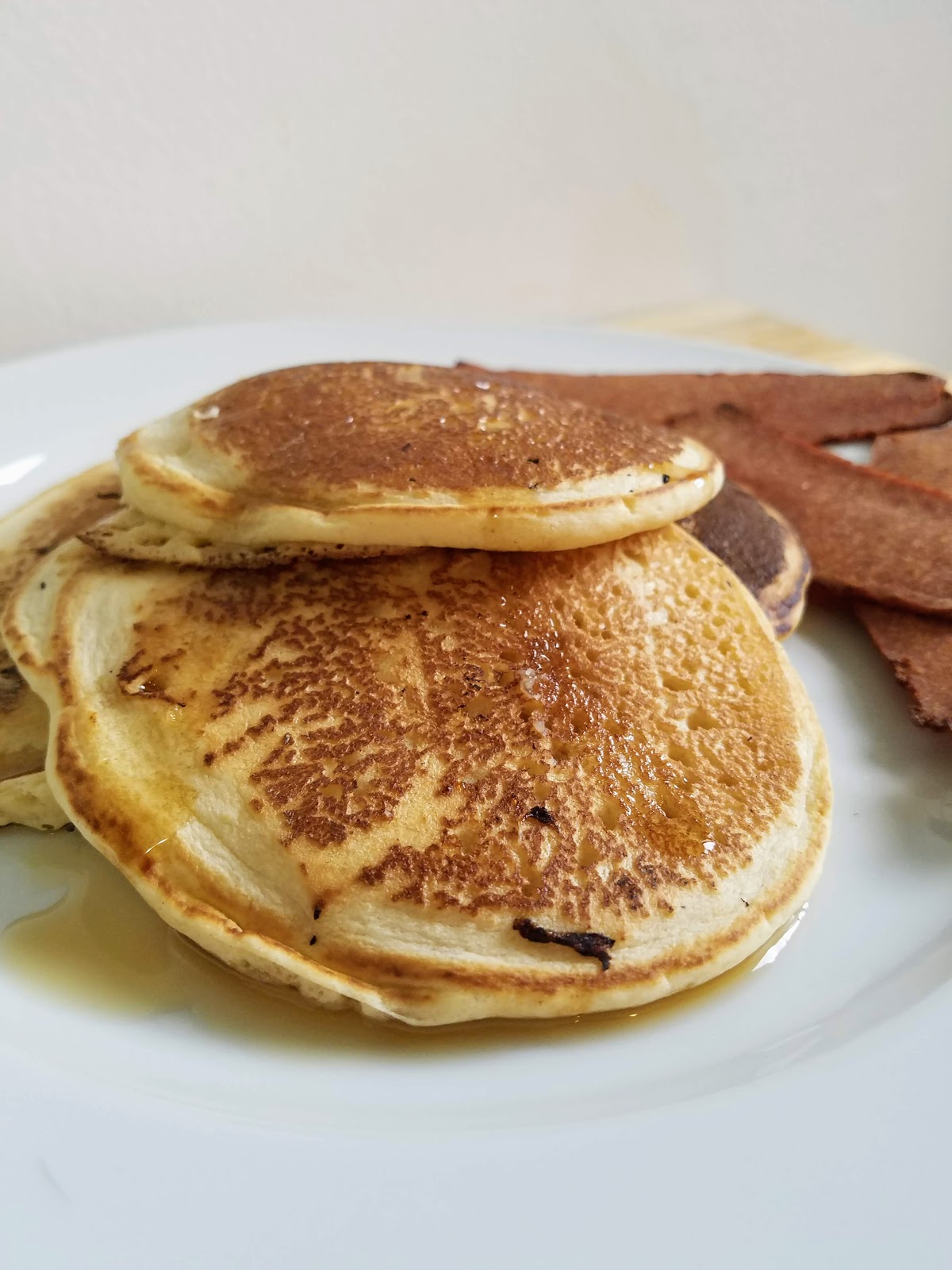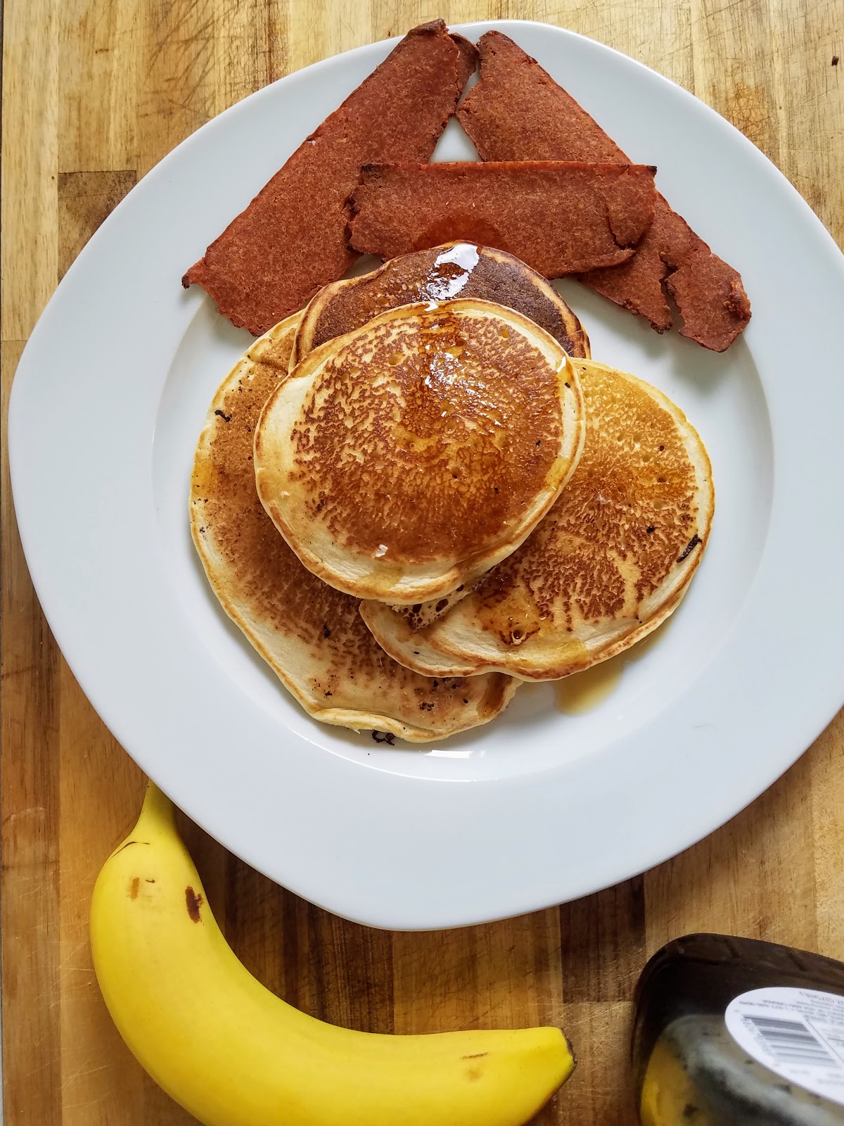 Add flour and baking powder to a mixing bowl. In a separate bowl, mix together the water and maple syrup. Pour the syrup mixture into the dry ingredients and whisk until smooth. Pour into a large measuring cup for easier pouring. Heat a nonstick skillet over medium high heat. Once hot (test with a drop of water – if it sizzles, it’s ready), pour about 1/3 cup of batter into the skillet and top with 2-3 slices of banana. After 1-2 minutes, or when the bubbling slows down, flip the pancake and cook for another 1-2 minutes on the other side. Repeat until the batter is finished. Keep cooked pancakes warm on a baking sheet in the oven set to a low temperature (200 degrees F or lower). Serve with more banana slices, vegan bacon, vegan butter, and maple syrup (optional). Happy breakfasting!