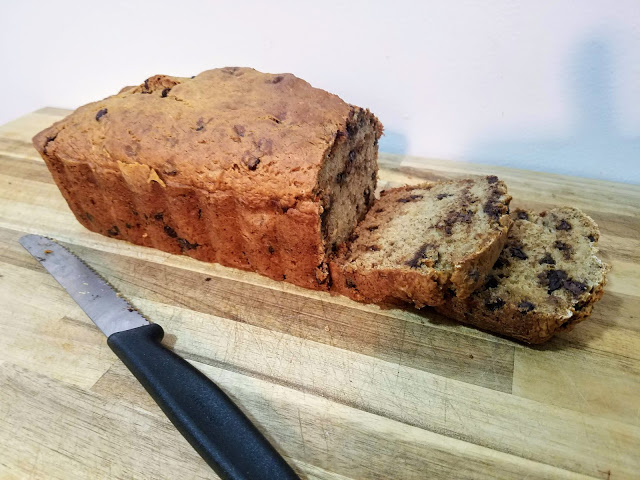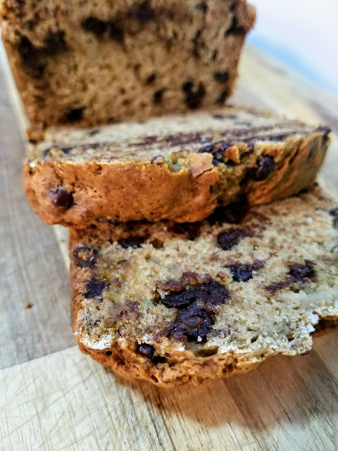 Preheat oven to 350 degrees. Grease a loaf pan and set aside. In a large mixing bowl, add flour, sugar, brown sugar, baking soda, baking powder, and cinnamon and mix well. In a separate bowl, whisk together mashed bananas, maple syrup, non-dairy milk, and vanilla. Add the wet ingredients to dry ingredients and mix gently until incorporated (don’t over mix, mix by hand). If it’s too dry, add another splash of non-dairy milk. Fold in the chocolate chips and pour in the loaf pan. Bake for 50-60 minutes or until a toothpick comes out clean. Let cool 10 minutes and serve. After one day, keeps best in the refrigerator.