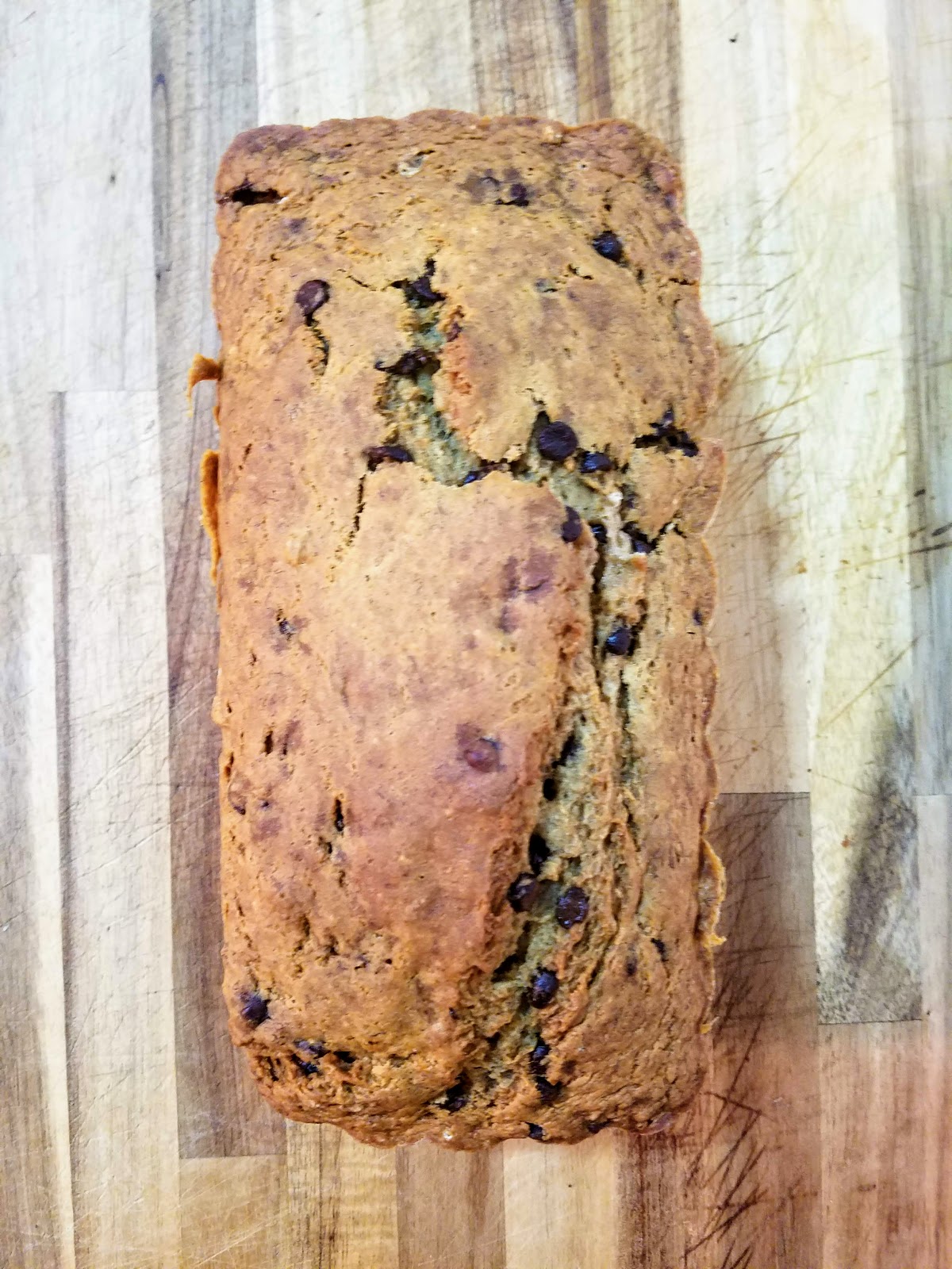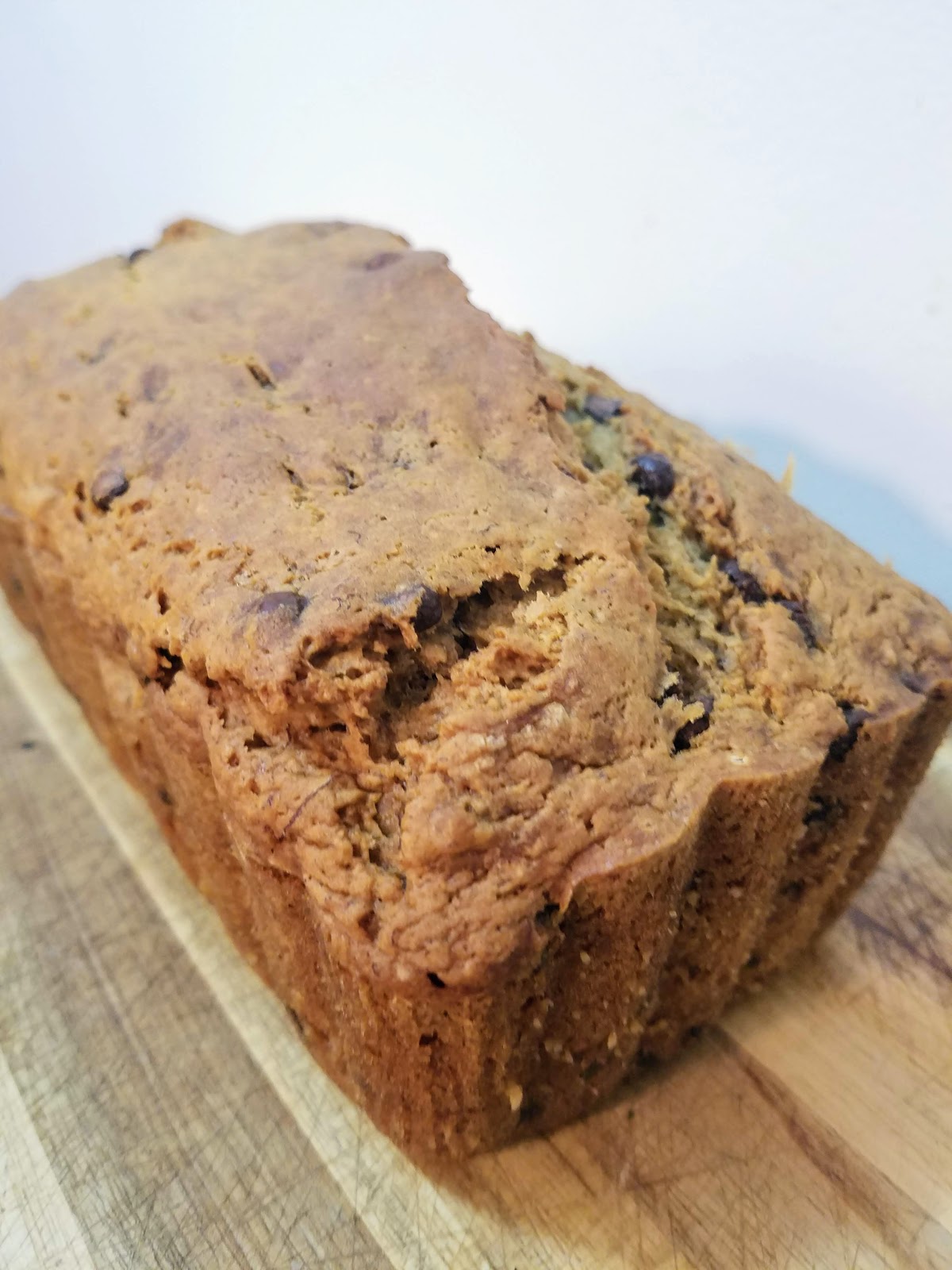 Preheat oven to 350 degrees. Grease a loaf pan and set aside. In a large mixing bowl, add flour, sugar, brown sugar, baking soda, baking powder, and cinnamon and mix well. In a separate bowl, whisk together mashed bananas, maple syrup, non-dairy milk, and vanilla. Add the wet ingredients to dry ingredients and mix gently until incorporated (don’t over mix, mix by hand). If it’s too dry, add another splash of non-dairy milk. Fold in the chocolate chips and pour in the loaf pan. Bake for 50-60 minutes or until a toothpick comes out clean. Let cool 10 minutes and serve. After one day, keeps best in the refrigerator.