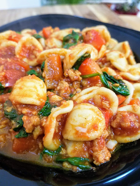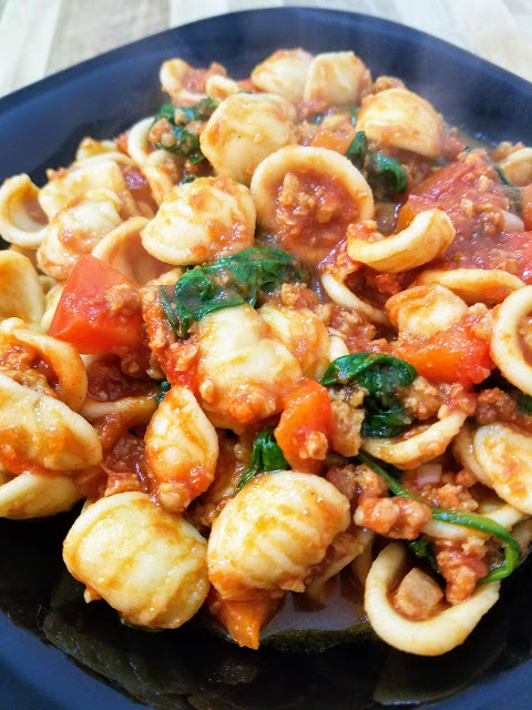 Boil pasta as instructed. Meanwhile, in a large skillet, heat olive oil over medium high heat and add garlic. Cook until starting to brown. Add frozen crumbles and cook for 2-3 minutes, stirring frequently. Lower the heat to low and add sauce, spinach, and Italian seasoning. Stir gently to fold in spinach and let simmer until the spinach is wilted and the sauce warm. Drain pasta, add to the skillet and stir into sauce. Serve immediately. Mangia!