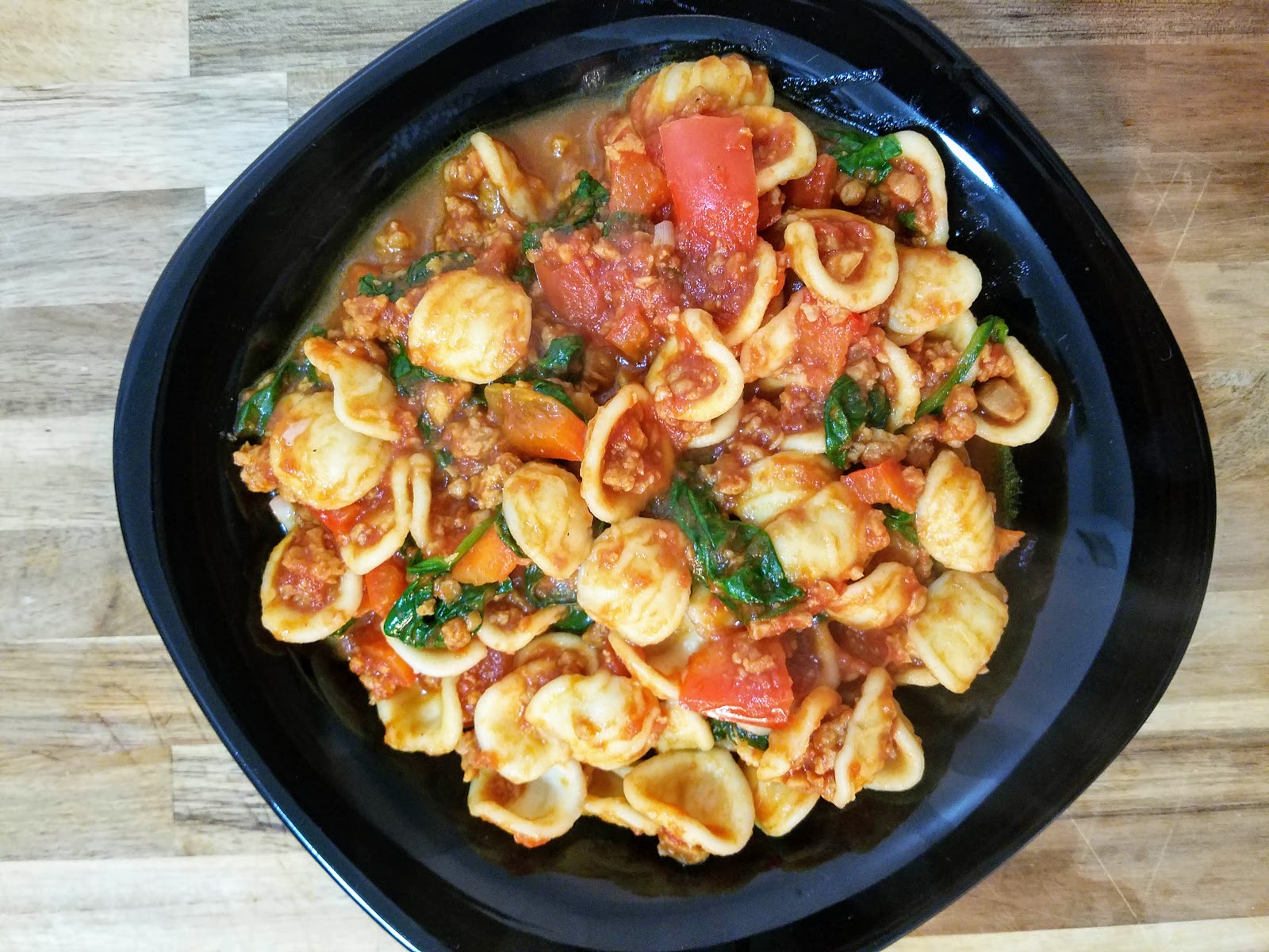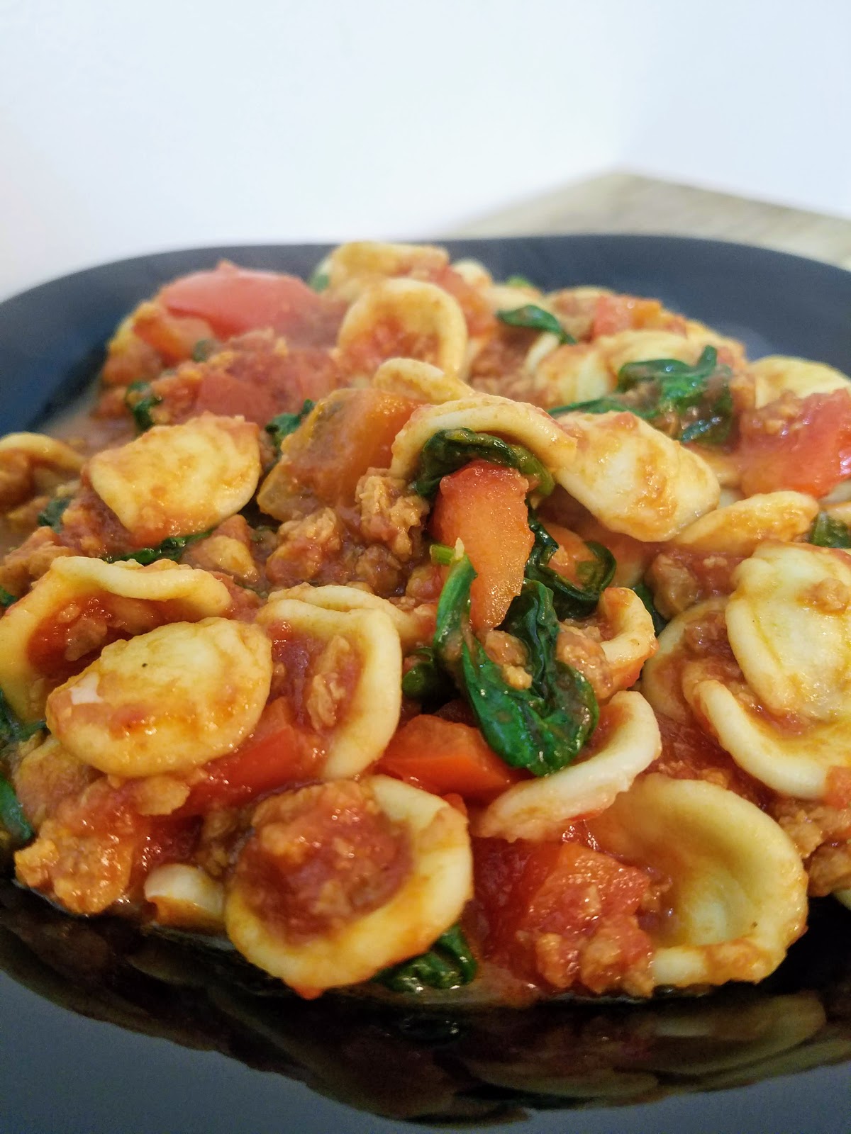 Boil pasta as instructed. Meanwhile, in a large skillet, heat olive oil over medium high heat and add garlic. Cook until starting to brown. Add frozen crumbles and cook for 2-3 minutes, stirring frequently. Lower the heat to low and add sauce, spinach, and Italian seasoning. Stir gently to fold in spinach and let simmer until the spinach is wilted and the sauce warm. Drain pasta, add to the skillet and stir into sauce. Serve immediately. Mangia!