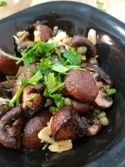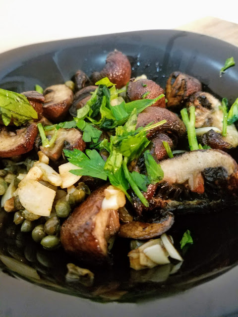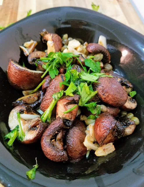 Preheat oven to 400 degrees. Place mushrooms on a baking sheet, sprinkled with salt and pepper. Bake for 15-20 or until tender and lightly browned. In a small saucepan, combine capers, butter, and garlic and heat over medium low heat until the butter is melted. Drizzle butter mixture over mushrooms and toss. Bake for another 2 minutes. Drizzle lemon juice and sprinkle parsley over mushrooms. Serve warm.
