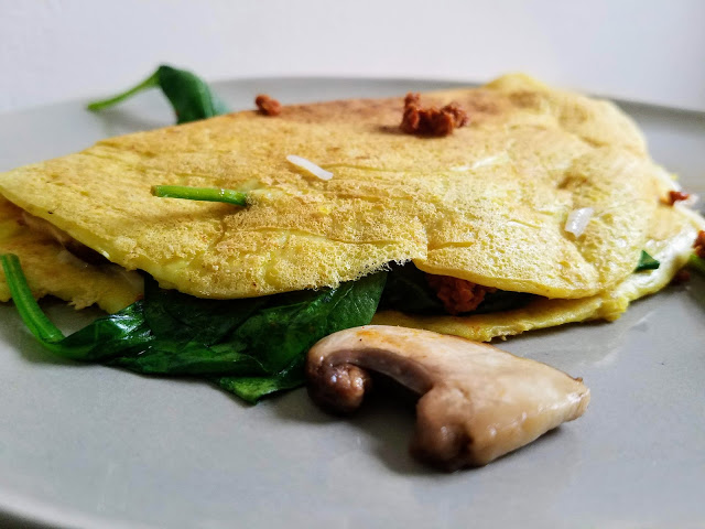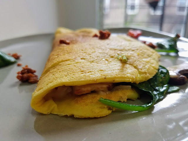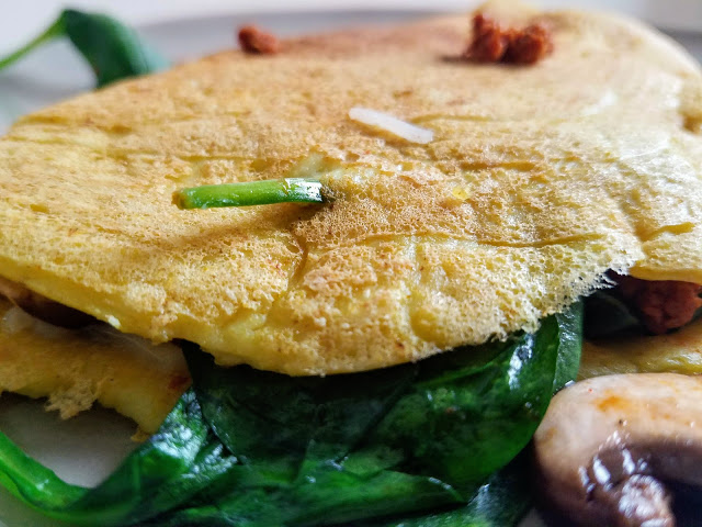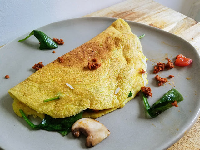 Prep desired toppings (I used daiya cheese, red pepper, mushroom, spinach, and soy chorizo) and set aside. In a food processor, blend garlic, crumbled tofu, nutritional yeast, olive oil, turmeric, and salt and pepper until smooth. Add flour and arrowroot powder and blend again, scraping down the sides to incorporate everything evenly. Brush a few drops of olive oil across the bottom of a large non-stick skillet. Preheat the skillet over medium heat (it’s hot enough when a drop of water sizzles). Add the omelet batter 1/2 cup at a time, and flatten out with a rubber spatula until you have an omelet that’s about 10 inches in diameter and about 1/2 inch thick. Allow to cook on that side for 3-5 minutes or until the top is mostly dry. To flip, start loosening it from the pan around the edges and make sure it isn’t stuck anywhere. If it’s stuck, it’s not ready. When it’s loosened from the pan, flip carefully with a spatula and cook for another 1-2 minutes. Fill half the omelet with toppings and fold the other half over the toppings and allow cheese to melt and stick for about 1 more minute. Serve immediately or cover with foil while cooking the second omelet.