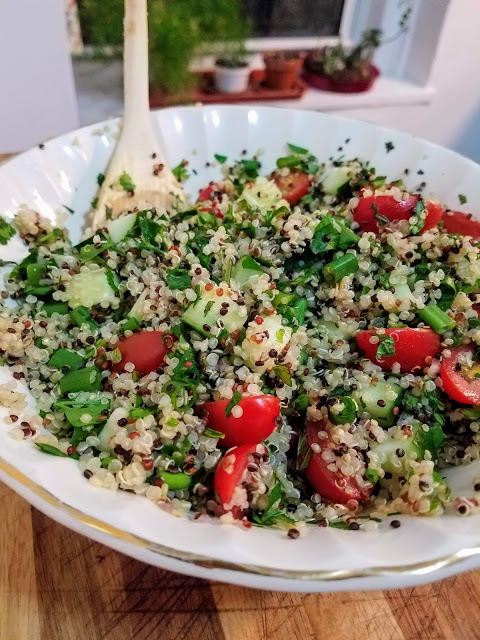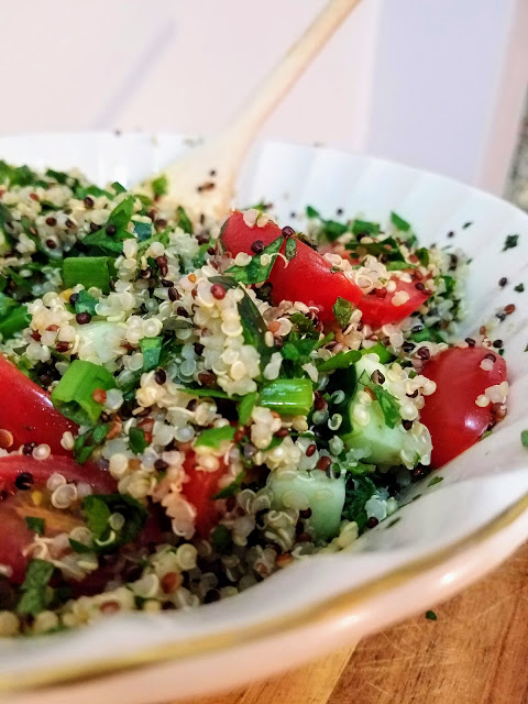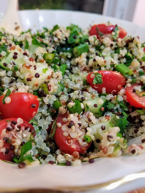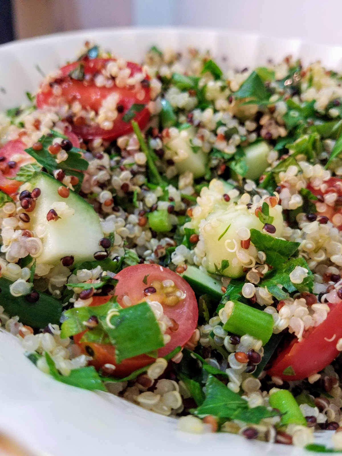 This version is a bit different because it uses quinoa as the grain base instead of bulgur. Most of the salad is actually chopped herbs, but the quinoa grains give it body and absorb the lemon-olive oil dressing to balance out the dish well. It also has high protein content and is delicious, so it’s a substitution with substance 😉