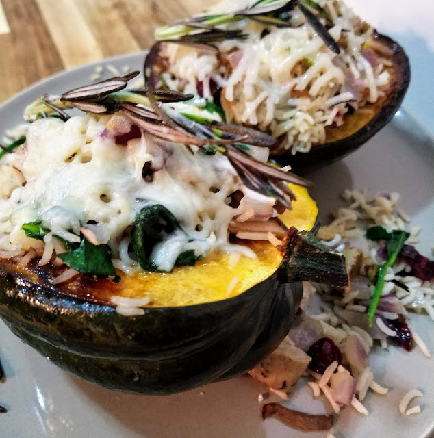 Preheat oven to 375 degrees. Drizzle olive oil and salt on the cut sides of the squash halves and place flesh side down on a baking sheet. Bake for 20 minutes or until browned and tender. Meanwhile, saute red onion in olive oil over medium high heat until soft. Add mushrooms and spinach and stir until the spinach is wilted. Next, add the sausage and the dried cranberries and cook for 1 minute. Stir in the rice along with a few drops of water and reduce heat to low. Stir occasionally until the squash is ready. Remove squash halves from oven and carefully turn over to be flesh side up. Fill with the rice mixture and top with cheese shreds if desired. Put back in the oven for another 7-10 minutes. Let cool for at least 5 minutes before serving.