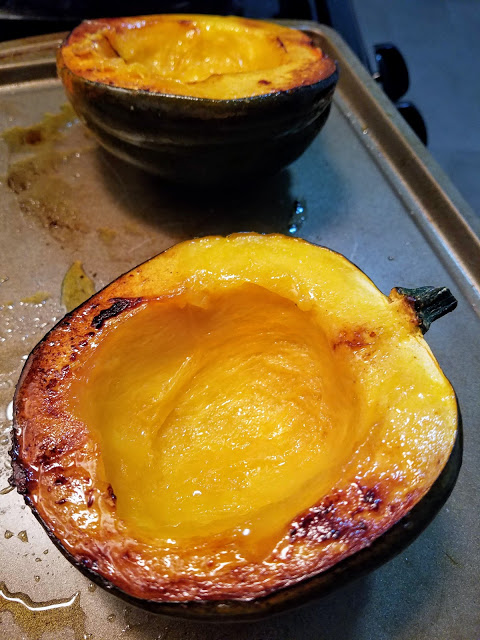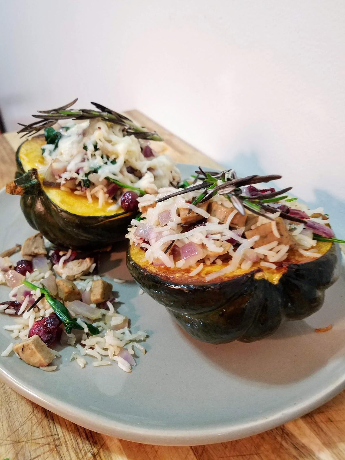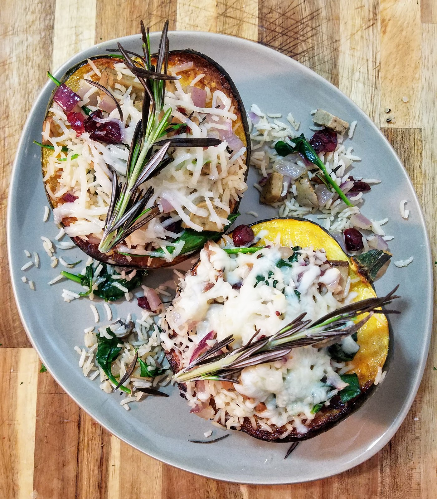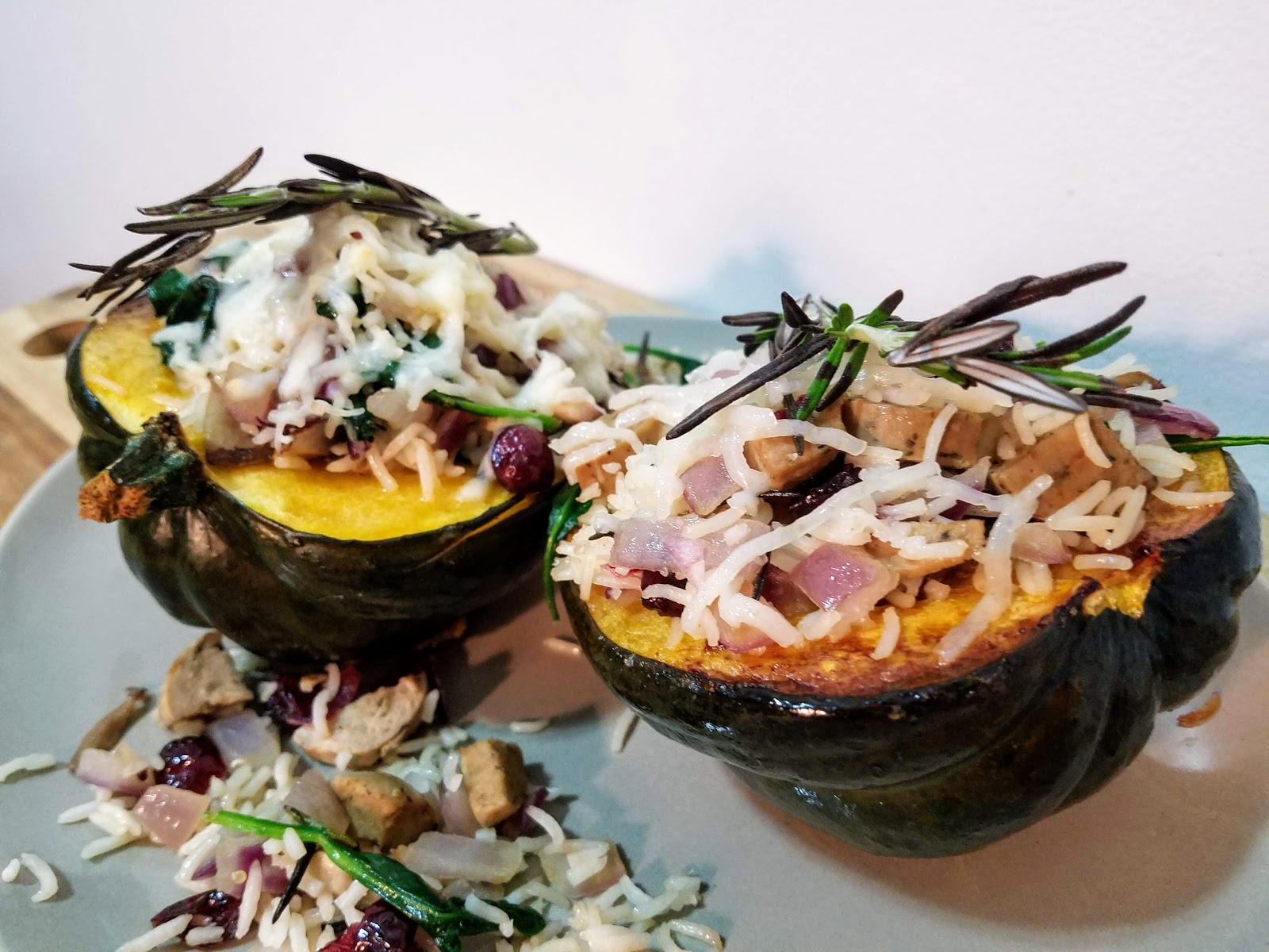 Acorn squash is such a great dinner option for our family because it is the perfect size for two, it doesn’t take forever in the oven, and it’s got a nice, distinct flavor that both hubby and I love. Sometimes I just quarter or slice the squash, roast it with dried rosemary, and serve it over rice pilaf. This time I decided to halve the squash and make use of the perfect little pocket inside for some stuffing.
