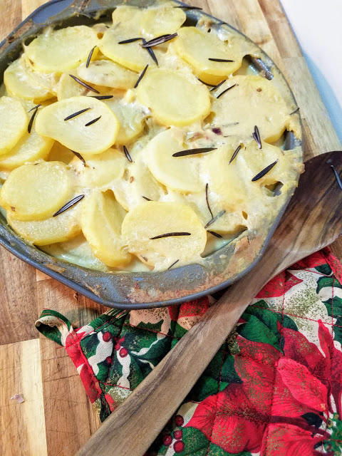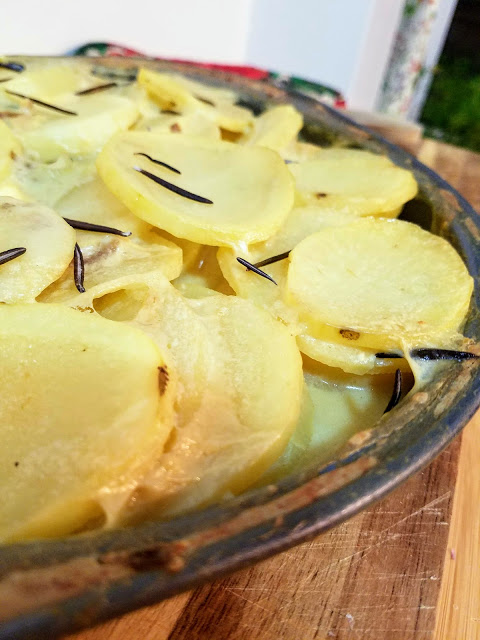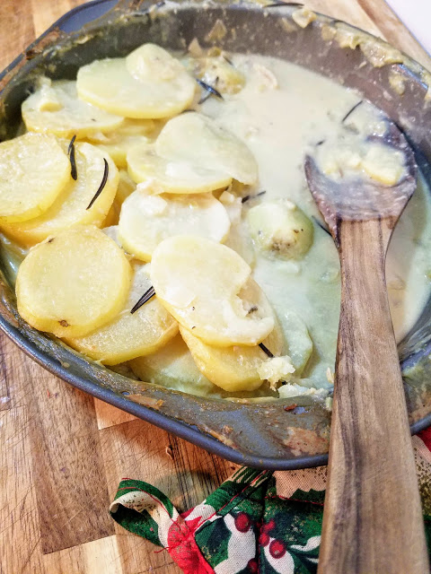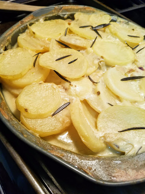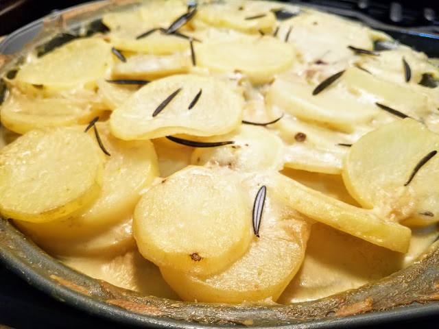 Preheat oven to 375 degrees. Slice the potatoes very finely, using a mandolin if you have one. In a large saucepan, heat garlic, coconut milk, almond milk, nutritional yeast, mustard, rosemary, bay leaf, and salt and pepper over medium high heat. Once it comes to a boil, carefully add the potato slices and shallots and stir gently. Pour potato mixture into a large casserole dish and cover with tinfoil. Cook in the oven for 20 minutes covered, and then 20 minutes uncovered. Let cool 2-3 minutes before serving.