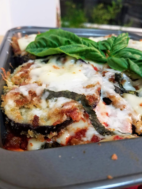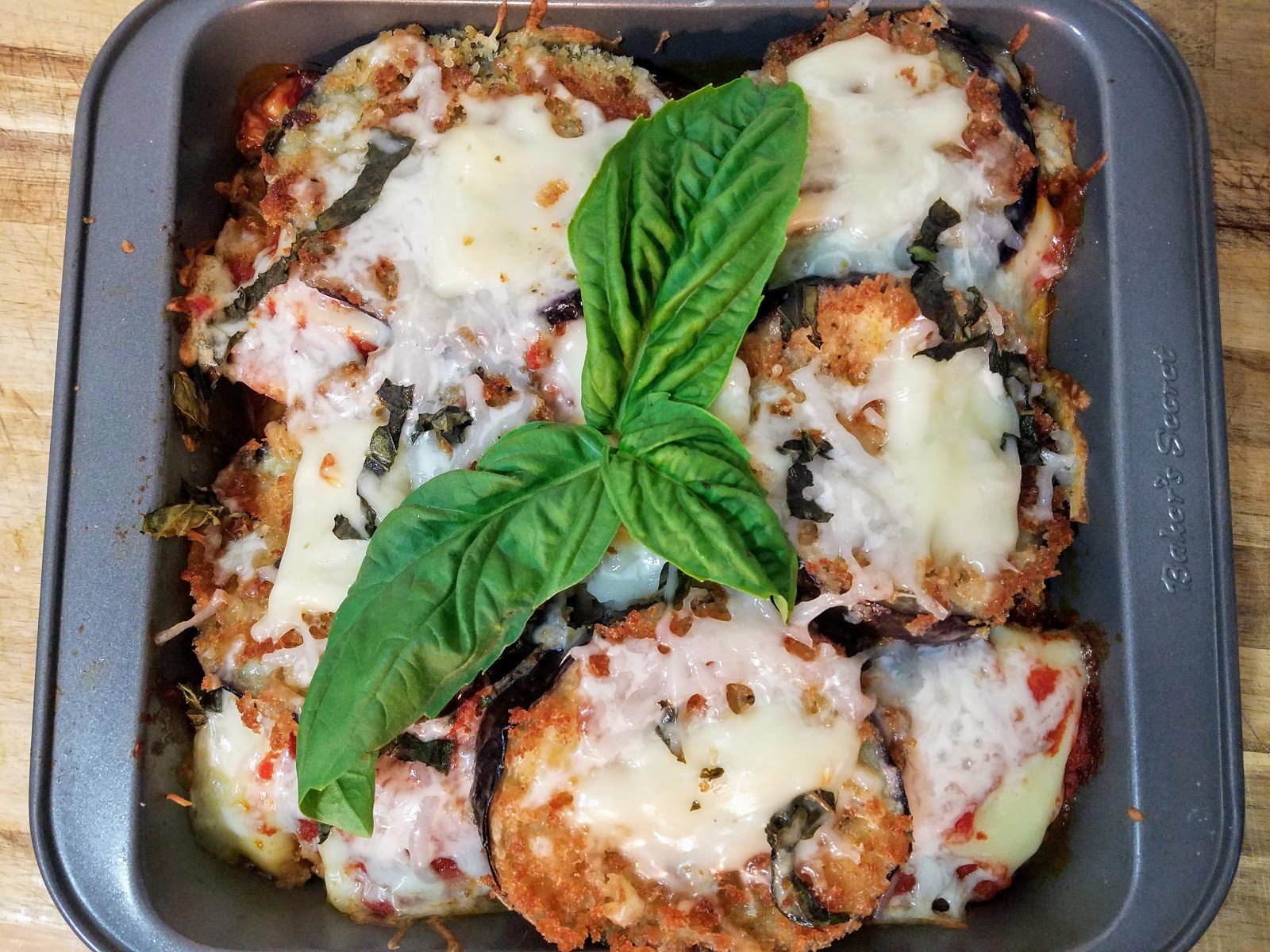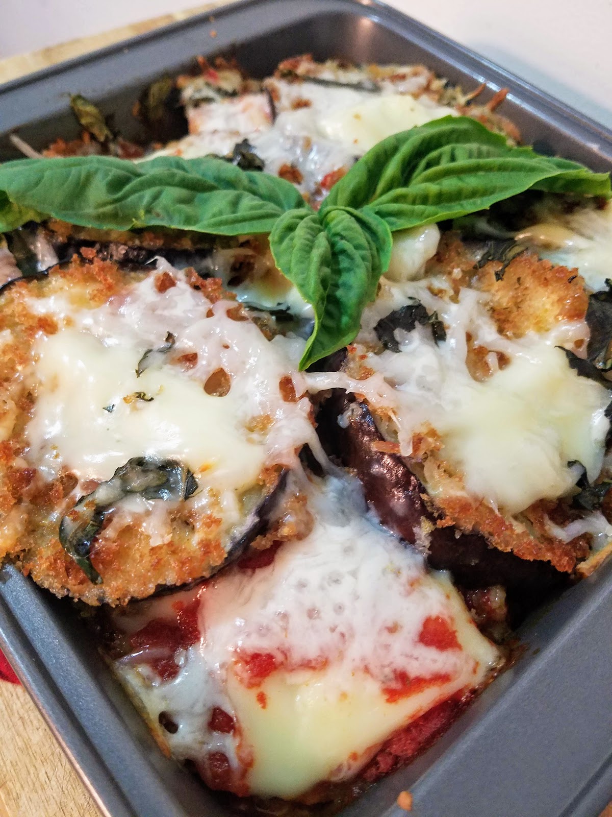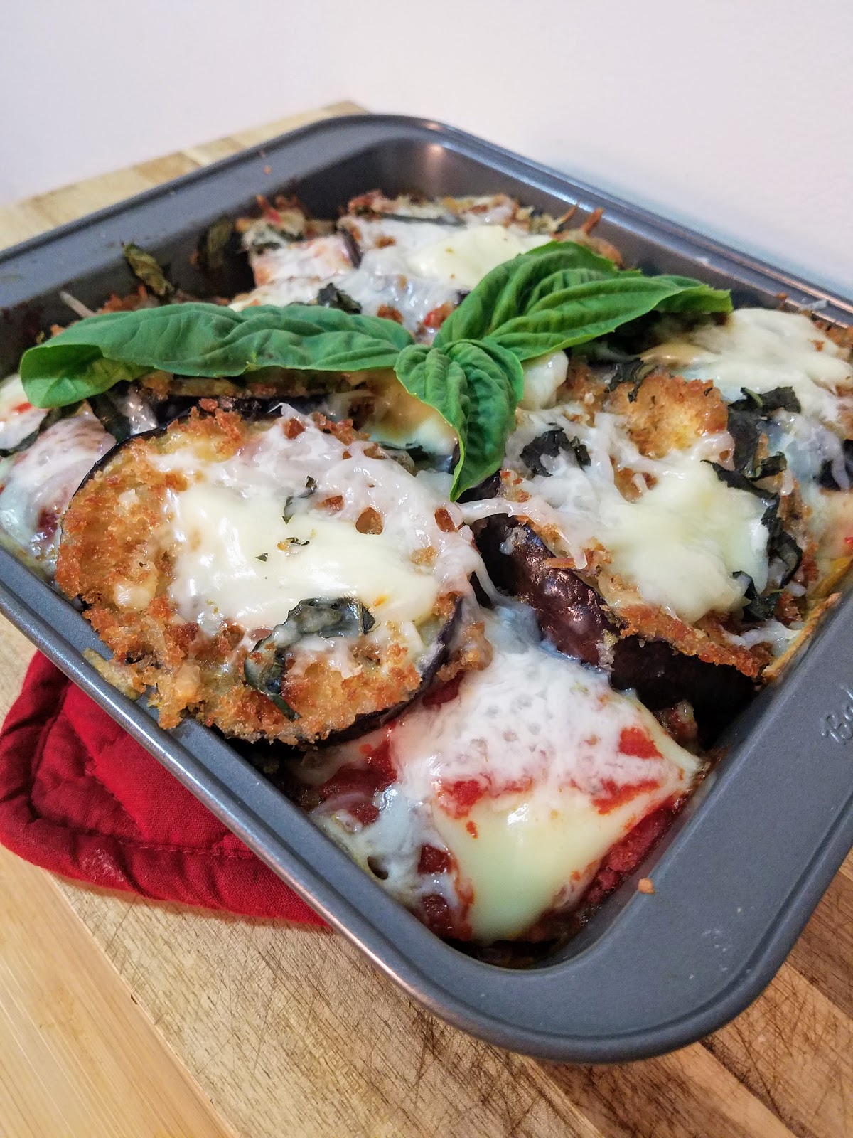 Preheat oven to 350 degrees. In a square 8′ pan, coat bottom of pan with tomato sauce. Next, cover sauce with one layer of eggplant slices. Top eggplant with a layer of mozzarella shreds, and then with chopped up basil leaves. Repeat with two more layers of sauce, eggplant, cheese, basil. Cover with foil and bake for 30 minutes covered, and 10 minutes uncovered (place under broiler if you want a golden brown topping).