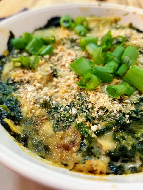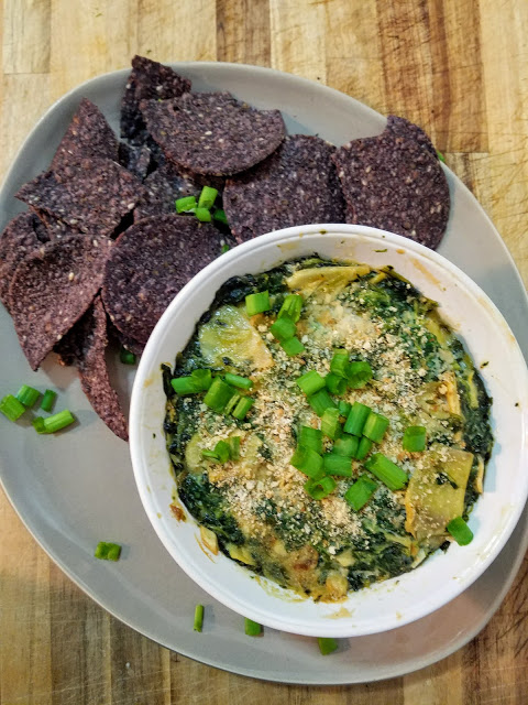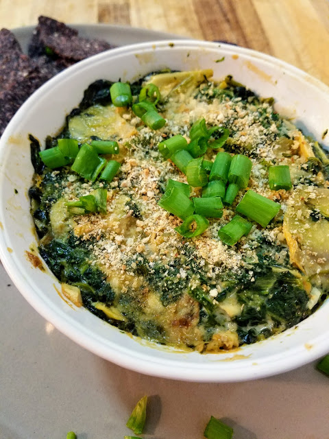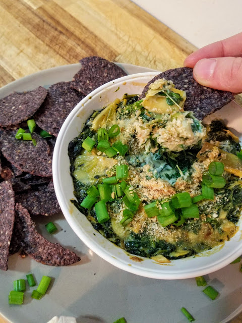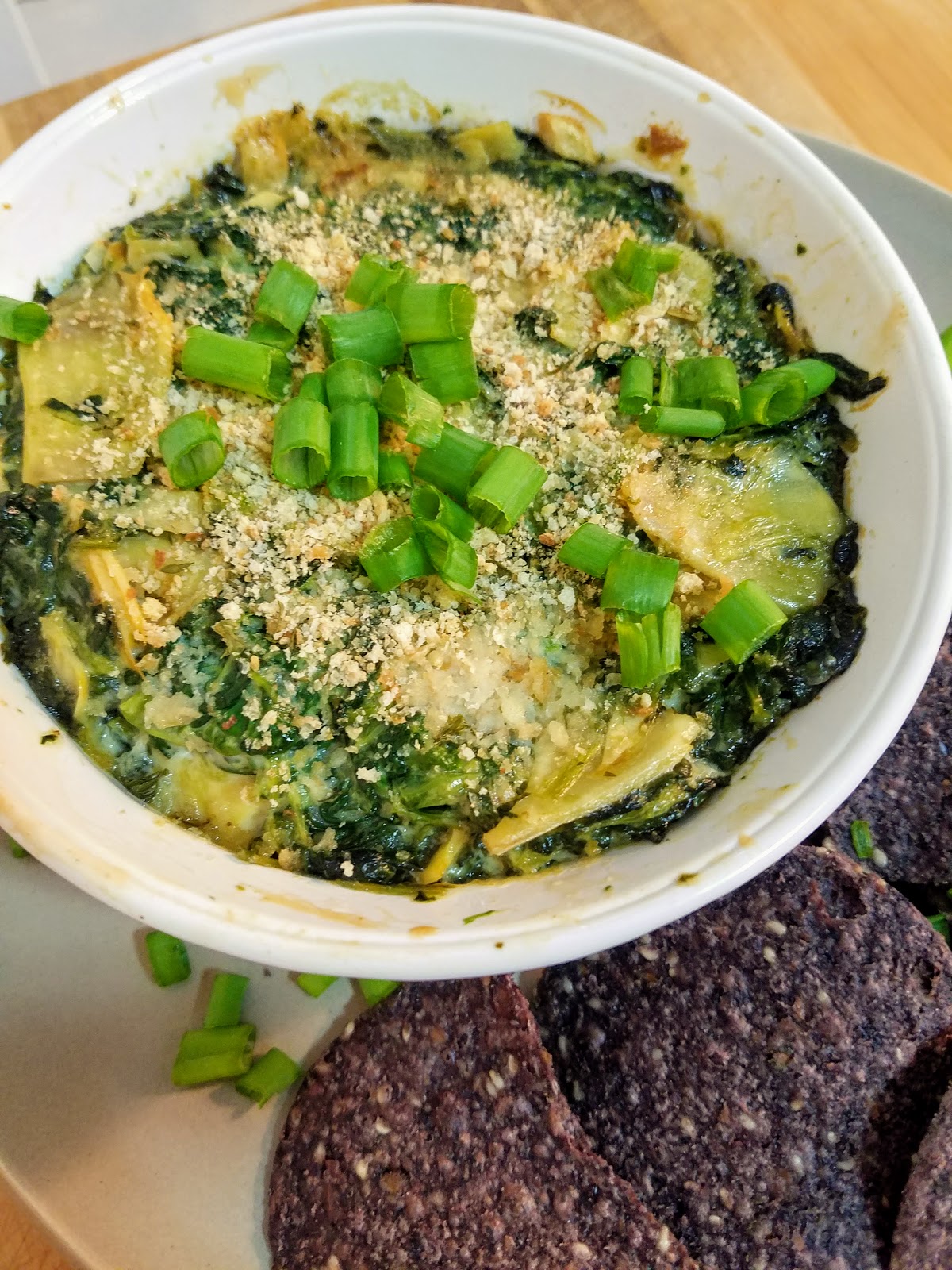 Preheat oven to 350 degrees. Mix together spinach, artichokes, nutritional yeast, garlic, and vegannaise and spoon mixture into a pie plate or an oven safe dish. Sprinkle top with bread crumbs and bake in the oven for 20-25 minutes. If you want a more golden brown topping, you can put it under the broiler for an additional 5 minutes. Garnish with sliced scallions and serve with tortilla chips or crackers.